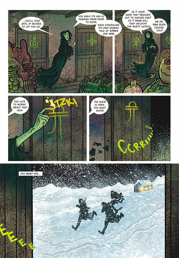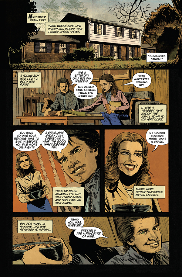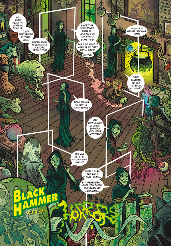 Tales from two diverse worlds! In Stranger Things, Eleven and the Demogorgon have disappeared from Hawkins, IN. Steve and Nancy try to cheer Mike up, encouraging him to get the adventuring party back together again. Then, in the world of the Eisner Award-winning Black Hammer series, Madame Dragonfly takes the reader on an EC-style tour through her mysterious Cabin of Horrors to witness two groups of brand new Black Hammer heroes from the past!
