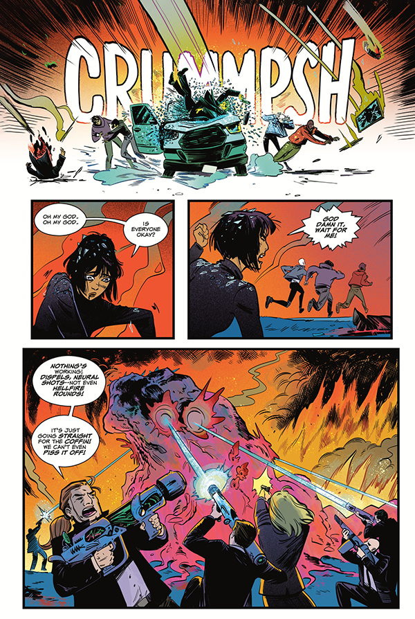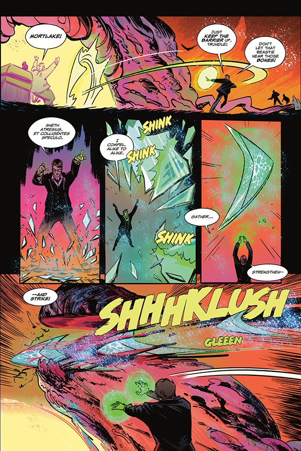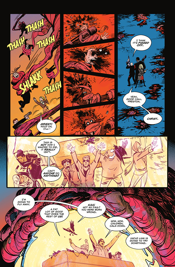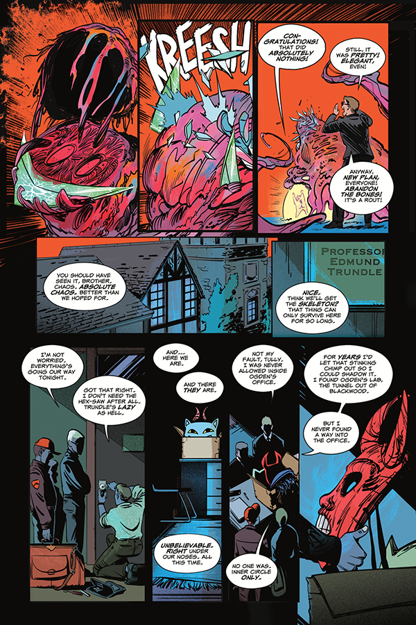 The Dark Wisdom conspiracy is revealed as the traitors make their move, and a sentient mass of interdimensional organ meat invades Dean Ogden's funeral. Making matters weirder, Chimp Ho Tep is on the loose and out for revenge, even if it means harpooning a student or two. The fur flies--as does the flesh--in the fiery finale of our four-issue frightfest. Phew!