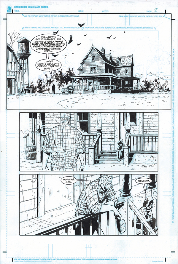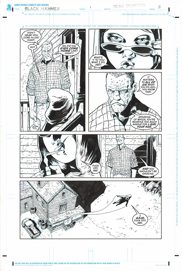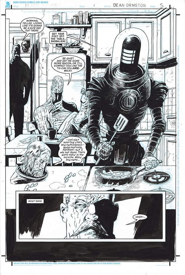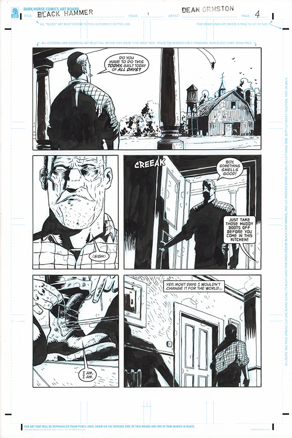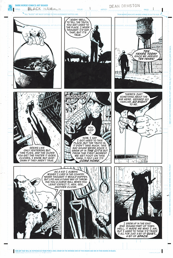 This deluxe, director's cut showcases high res, uncleaned scans of Dean Ormston's beautiful inked line art from the first issue of the award-winning Black Hammer series, with Todd Klein's lettering overlayed on top, and also Jeff Lemire's original script, and a high res scan of the original cover.