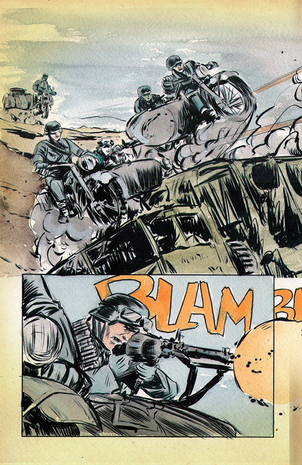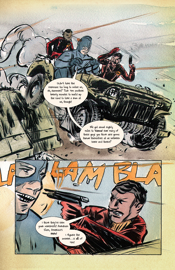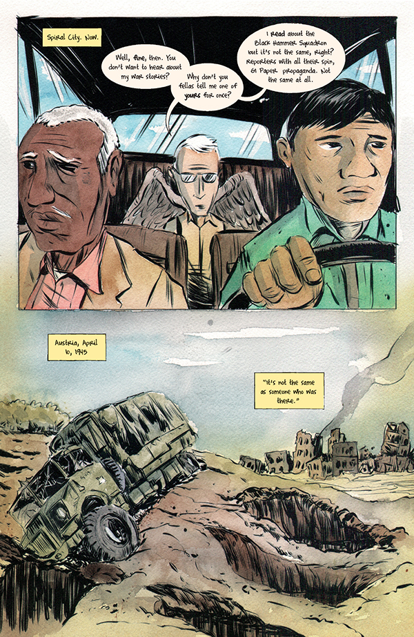 The Black Hammer Squadron, with the aid of a familiar hero, continue on their perilous mission to save acclaimed scientist Herman Greenbaum and his family from the Nazis. However, with a battle between Nazarova's Soviet mechs and the fabled Ghost Hunter raging above the Greenbaum's heads, time may be running out!