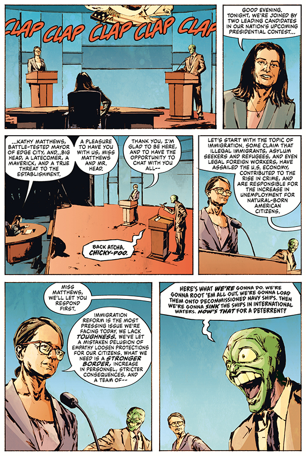 In the presidential debate of the century, a woman with a noble cause takes on a deranged, green-headed murderer who promises to provide every tax payer with as much high-tech weaponry as they can carry.