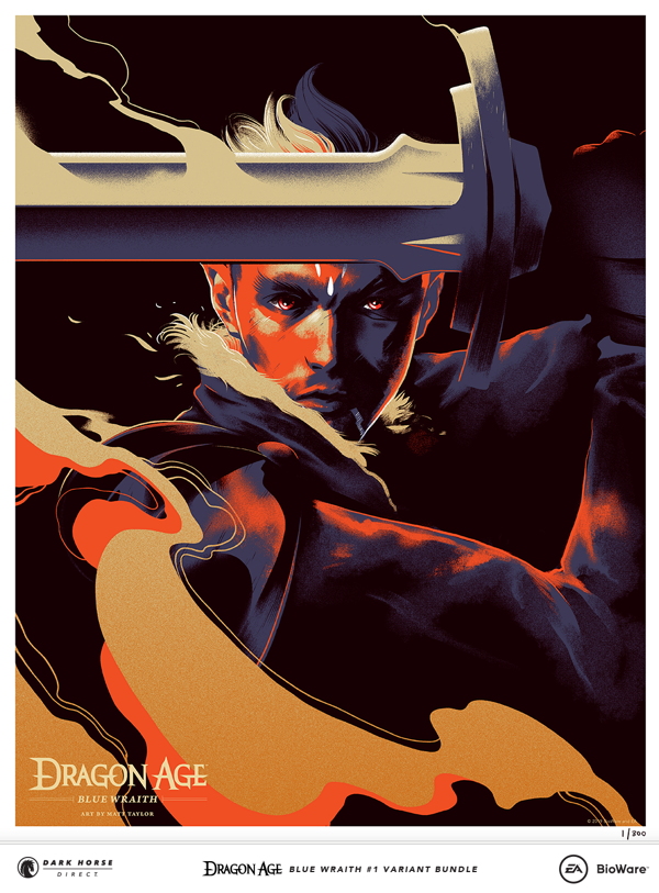 Dark Horse Direct and BioWare are proud to present our first ever Dragon Age variant comic and giclée fine art print bundle for the new Blue Wraith comic series. Featuring the dazzling art of Matt Taylor, mages beware as the elven warrior, Fenris, prepares for battle. A limited edition of 300, grab hold of this spectacular bundle while supplies last before it phases through your grasp!