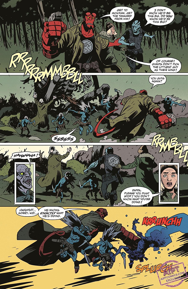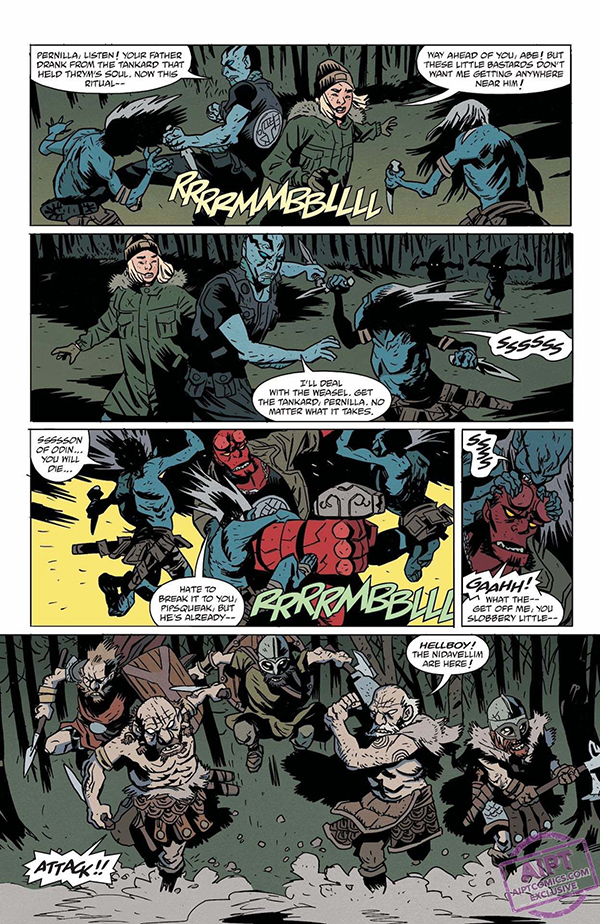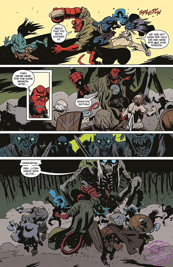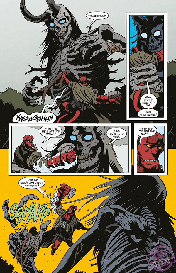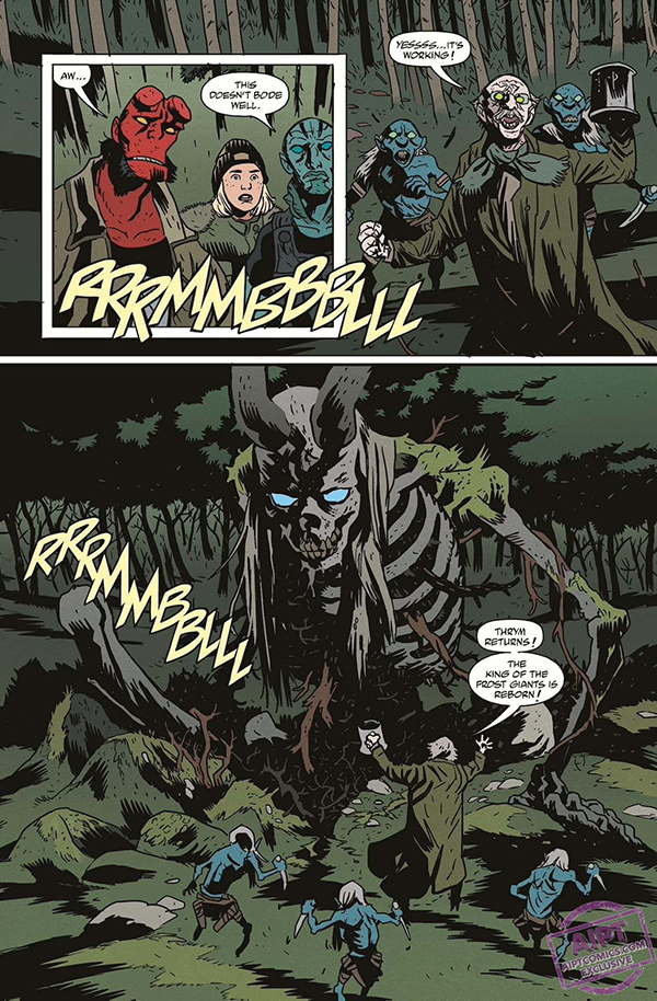 Hellboy, still inhabited by the ghost of the Norse god Thor, has his first confrontation with the newly resurrected Frost King Thrym! But not having recovered his full strength yet, Thrym slips away and leaves Hellboy to follow a grisly path toward their next encounter.