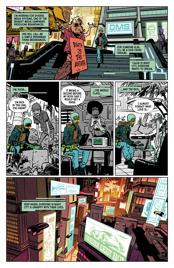 It hurts. Night City hurts. The suffering runs deep and the deeper one falls, the longer the self-prescribed dreams play. Fortune, hope, love--all made possible by DMS technology. But not everyone desires a happy ending. A braindance repairman discovers the answer to pain . . . comes in a blackout.