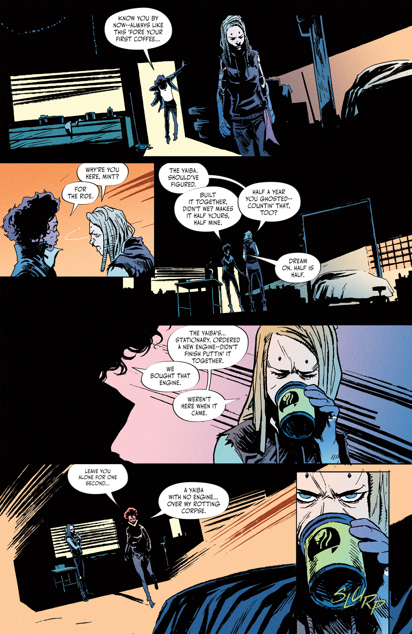 Mint pays an old friend a visit who has something that belongs to her— something made just for her . . . On the tail of an exclusive meet with the long sought-after Kickdown, Mint must play both sides—but to move at full speed, there’s bound to be a crash.
