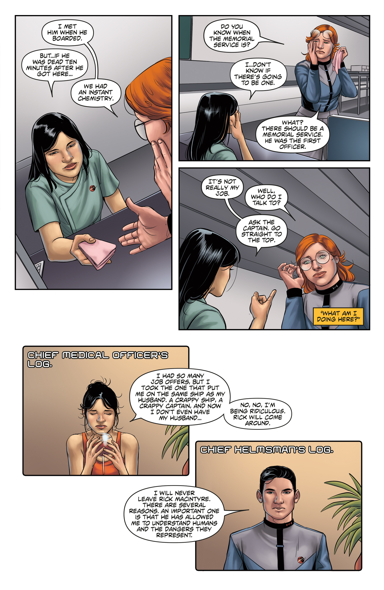 It's about time someone on this ship took some initiative, and Ensign Masht is on the case! First thing, the late First Officer Sheridan needs a proper send off. While Masht begins work on Sheridan's memorial, Travis prepares to jump ship (and careers), Dana might have to face the facts about her marriage, and Captain Olivier takes decisive action to outmaneuver the Clooney.