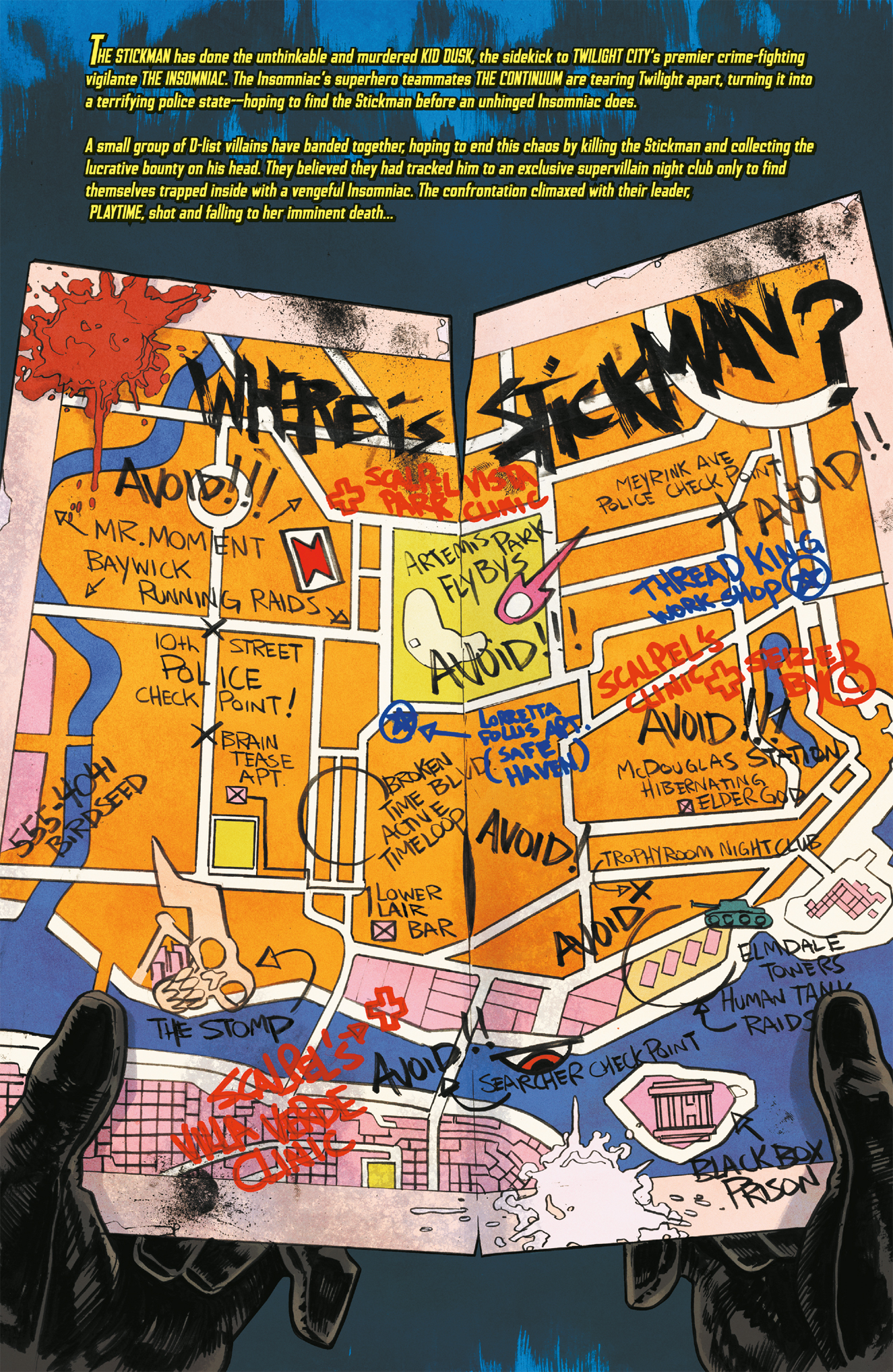 Our group of D-list costumed villains set out across the city to hunt down the lethal, criminal-mastermind the Stickman, and collect the lucrative bounty on his head. Hoping to find him at an upscale nightclub for super villains they instead encounter something more terrifying--the unhinged vigilante hero, The Insomniac, out for revenge.