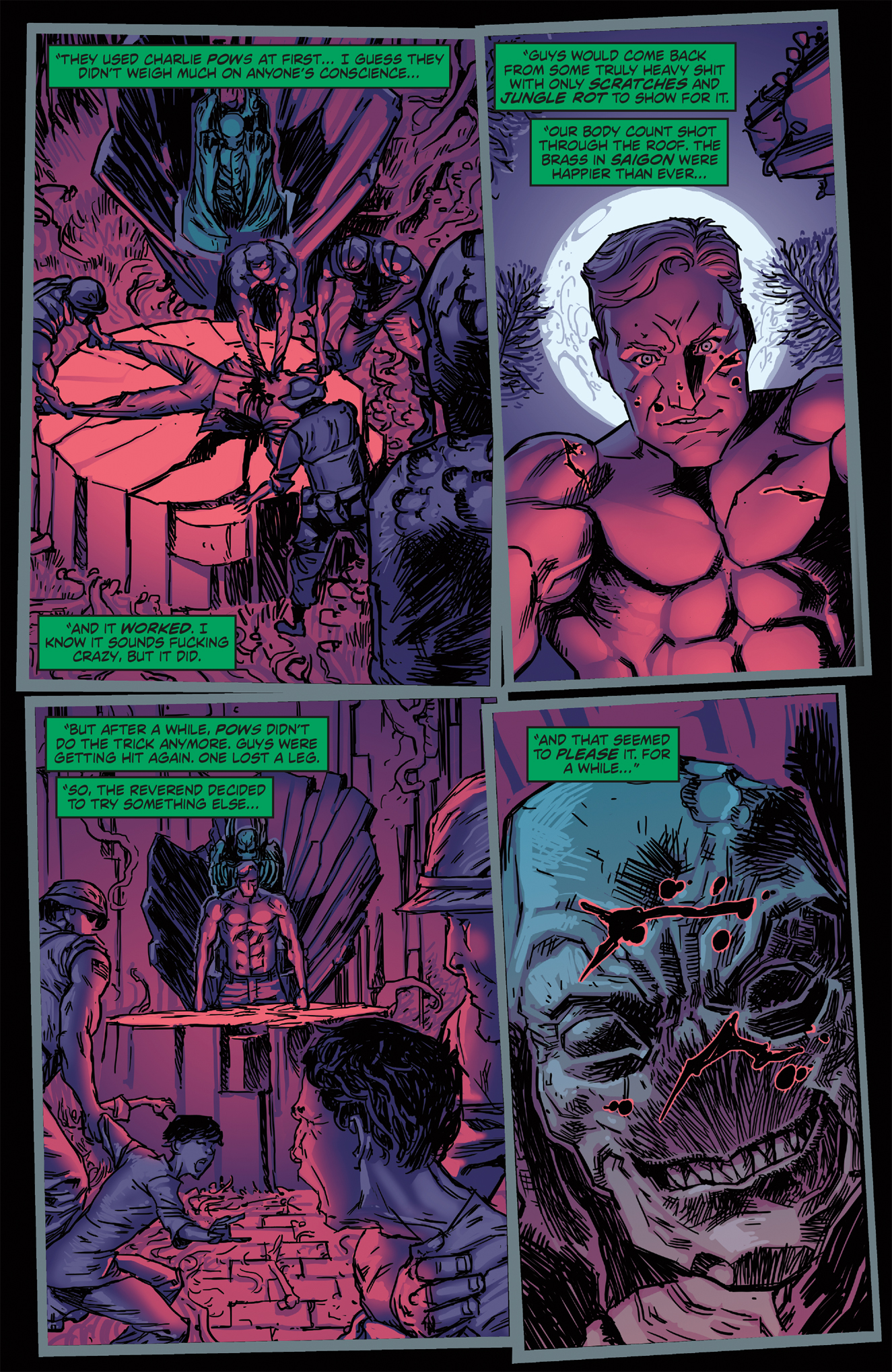The dark secrets of Firebase Tartarus are finally coming to light. A hidden sanctuary. A bloody sacrificial altar with a freshly flayed corpse. A pile of bones as big as the list of MIA soldiers. Just how high in the ranks does this evil reach?