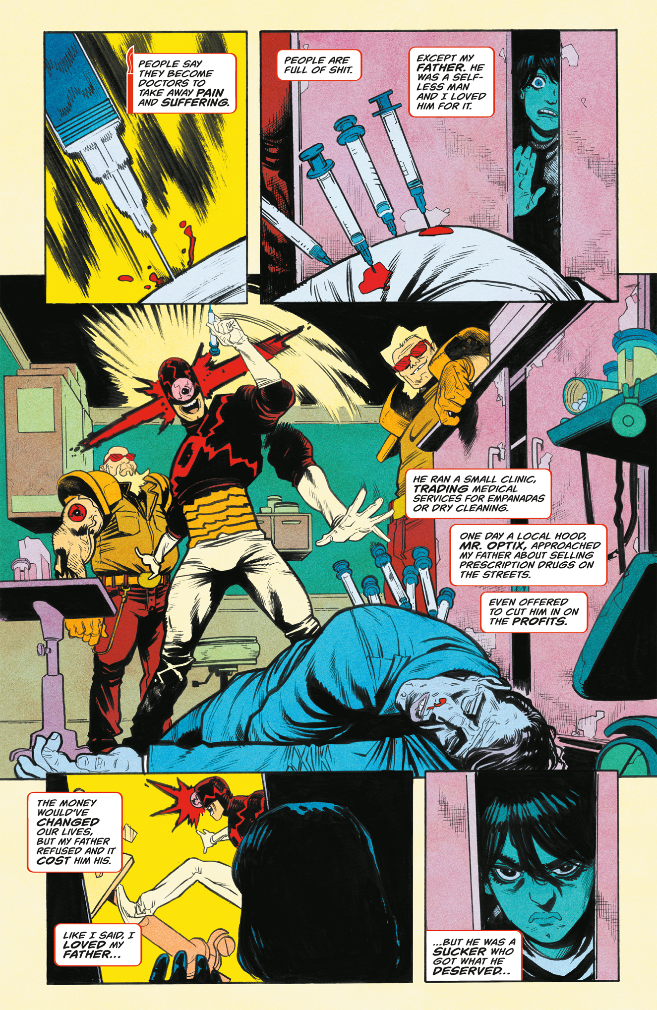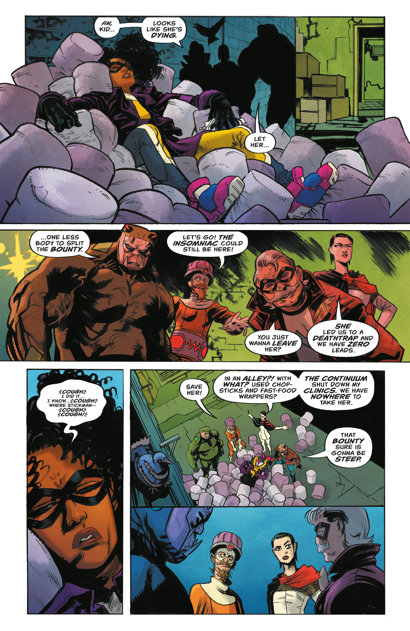 Our group of D-list costumed villains set out across the city to hunt down the lethal, criminal-mastermind the Stickman, and collect the lucrative bounty on his head. Hoping to find him at an upscale nightclub for super villains they instead encounter something more terrifying--the unhinged vigilante hero, The Insomniac, out for revenge.