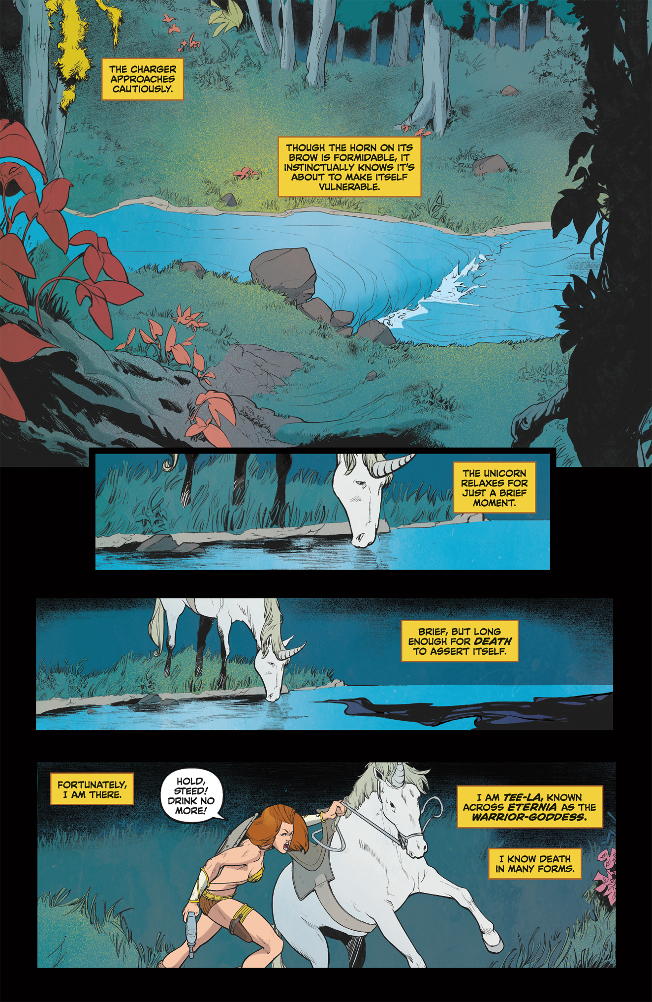 Tensions rise as the Sorceress of Grayskull shows Zodac heroes influenced by He-Man from across the multiverse. In an Eternia ravaged by war and left shattered, a Goddess known as Teela must free the Beast Man shaman from a tribe of superstitious barbarians. And when a drunken group of explorers who jokingly call themselves Masters of the Universe run ashore on the Isle of Gray Skulls, they must decide if saving a captured sorceress is as important as procuring loot.