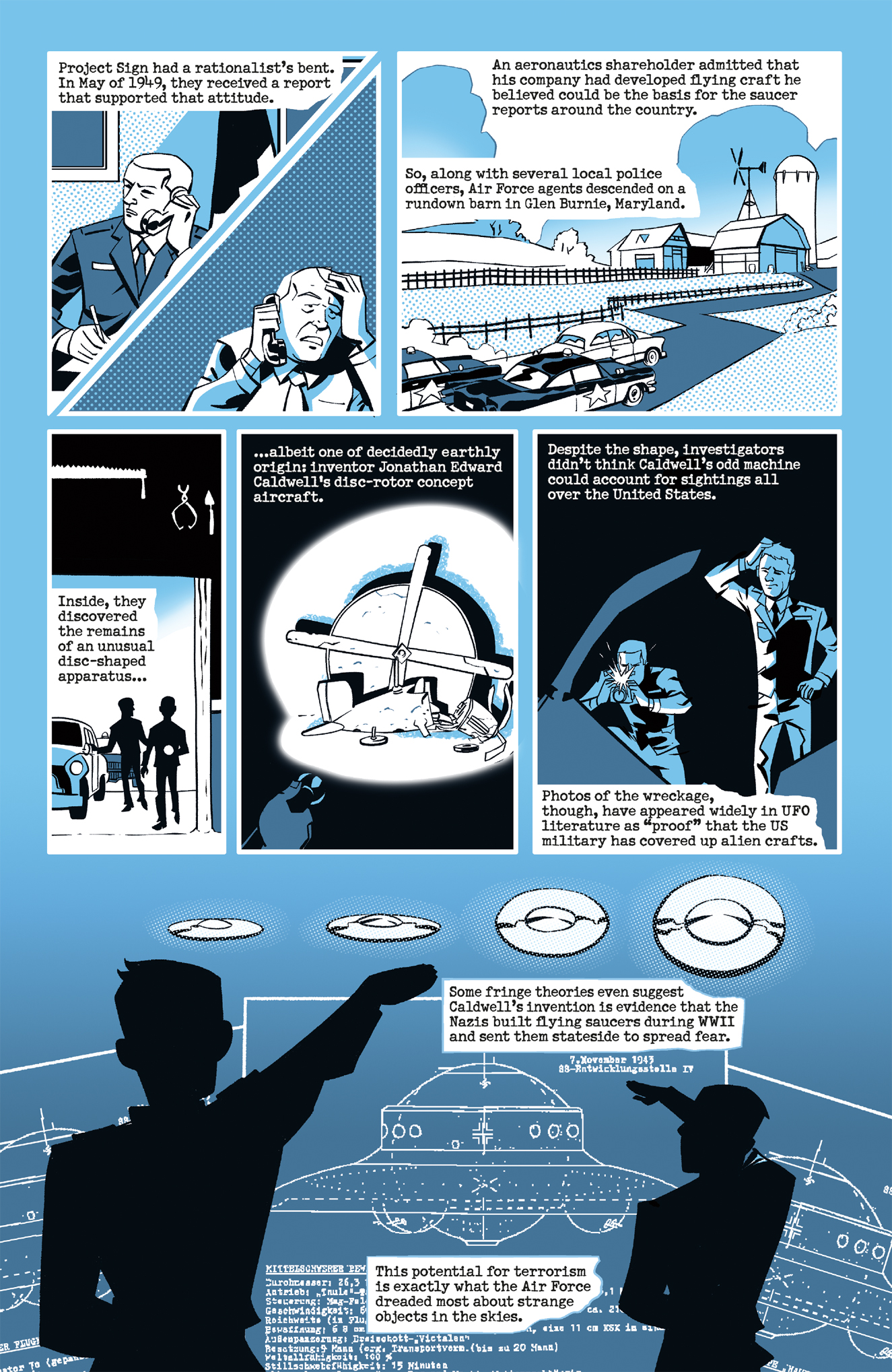 The wave of “UFO hysteria” in 1947 was strong enough to spur the official Federal investigations of unidentified flying objects and launch Project Blue Book by the U.S. Air Force in 1952. In the final chapter of the Blue Book: 1947 series by James Tynion IV and Michael Avon Oeming, we see the causes of this national fervor and the beginnings of the grip on pop culture that have lasted for almost a century.