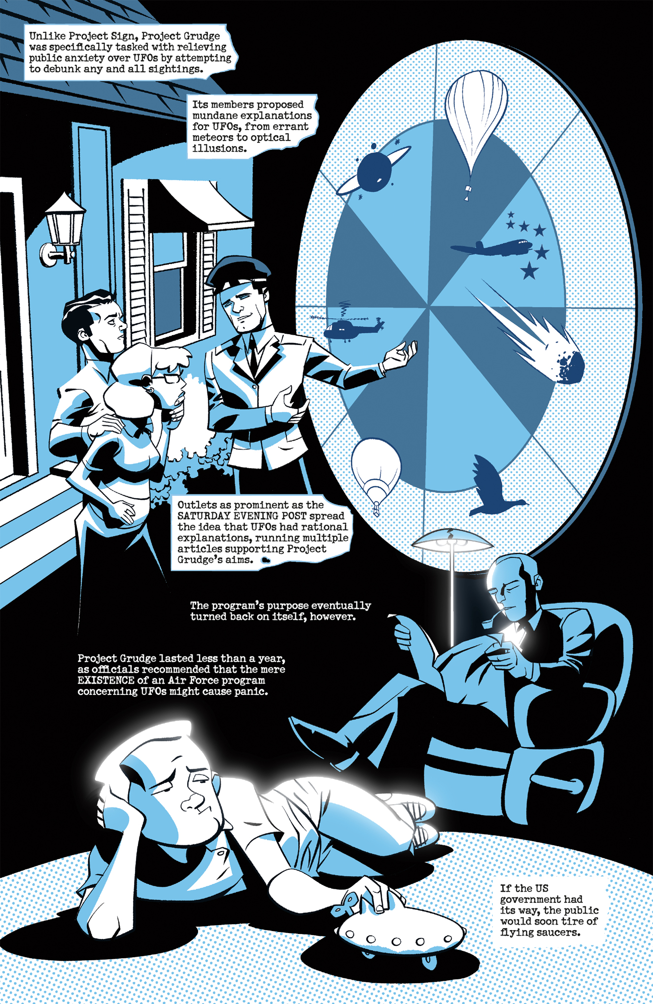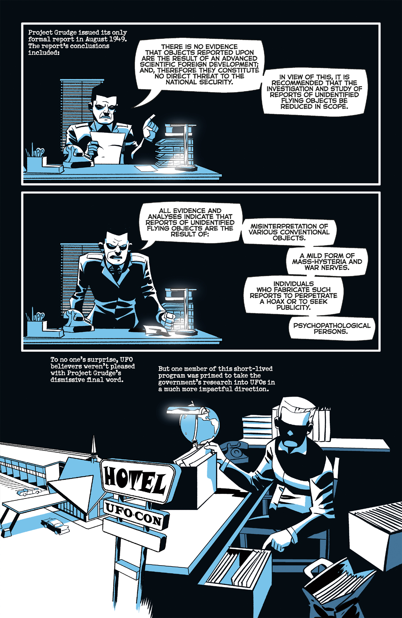 The wave of “UFO hysteria” in 1947 was strong enough to spur the official Federal investigations of unidentified flying objects and launch Project Blue Book by the U.S. Air Force in 1952. In the final chapter of the Blue Book: 1947 series by James Tynion IV and Michael Avon Oeming, we see the causes of this national fervor and the beginnings of the grip on pop culture that have lasted for almost a century.