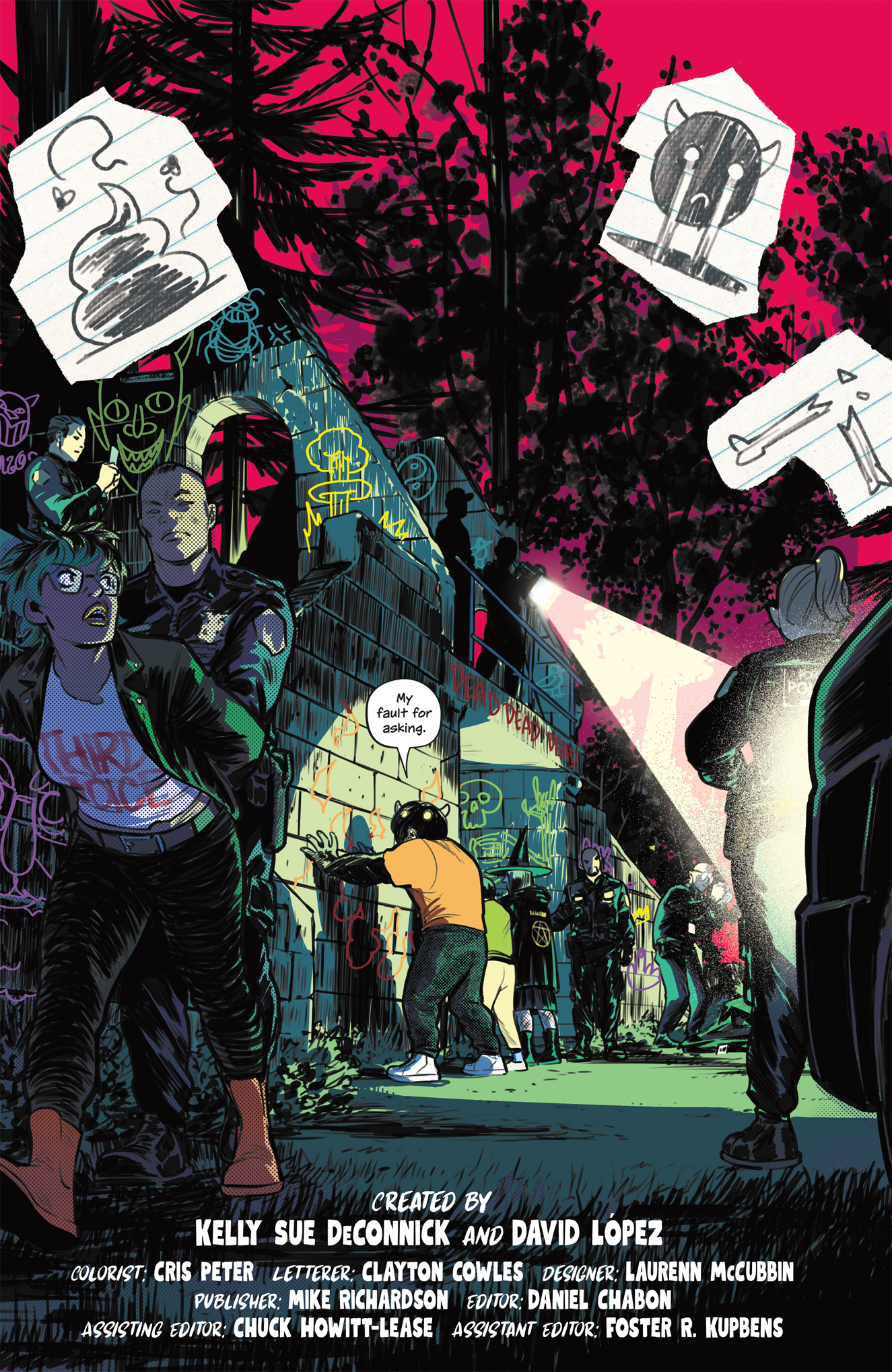 “8 Minute Murders” buzzes with theories about the dead man at the Witch’s House, as the city plans the structure’s long-overdue demolition. In an effort to save it, Glory and Savvy dive deeper into its history, while Lydia, our polar bear detective, seeks truths. Meanwhile, Riley turns to his mom with his trauma and the two reconnect through their art. This issue is a darker turn for the series, but the return of Dad from an absurd job in LA adds a light-hearted twist, and the introduction of Susan, the mysterious new assistant linked to past secrets, moves the plot along. FML Issue 4 sees the middle-aged riot grrl coven reconvene and struggle with their culpability for the murder, while the fires close in on all sides.