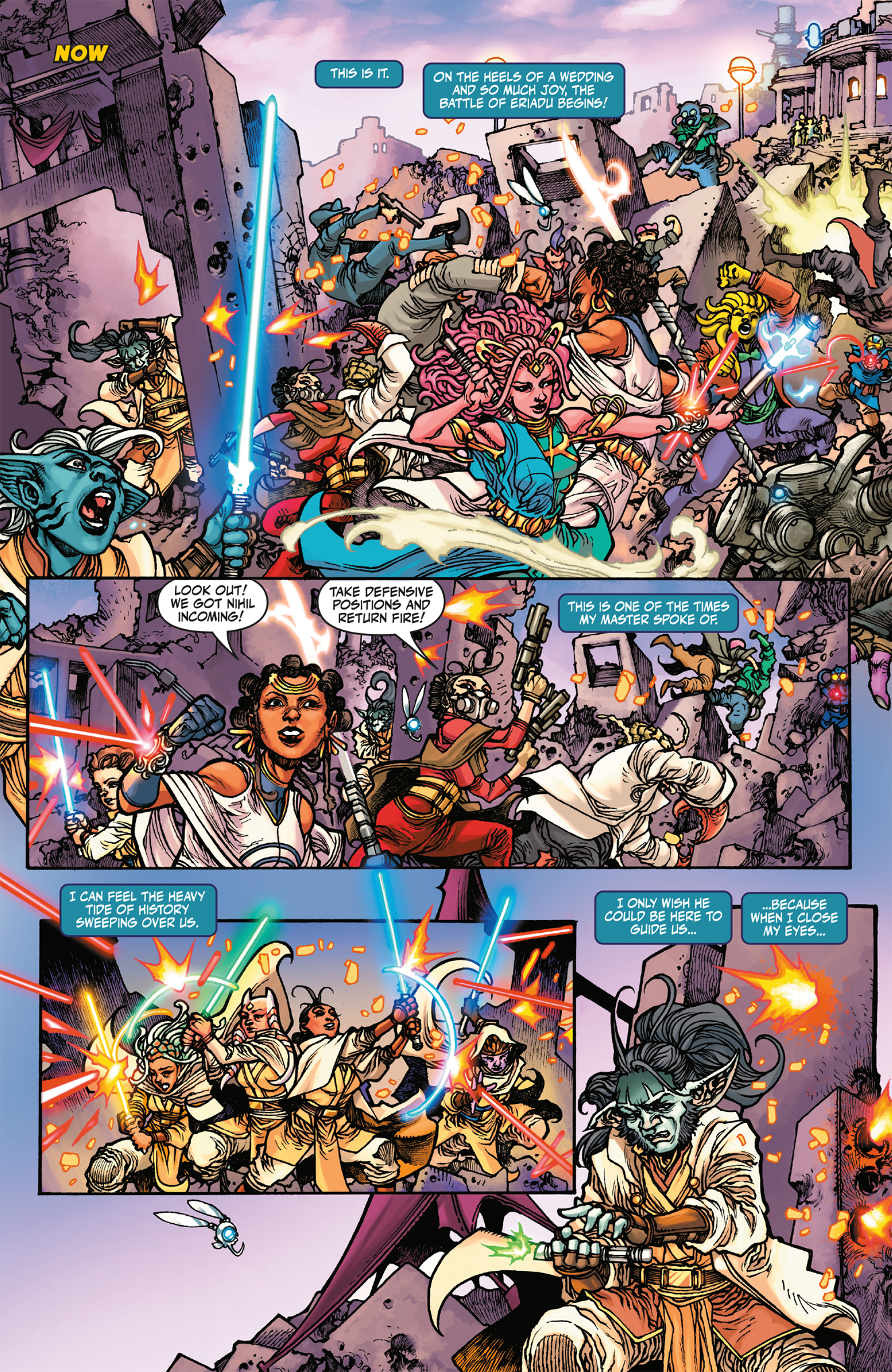 Fighting erupts on Eriadu! After months of oppression by the dastardly Nihil, valiant partners Lula and Zeen lead the charge against the occupying force. Meanwhile, a hidden danger stirs beneath the battlefield that threatens to turn the tide of the war, but in whose favor? The fate of the galaxy is on the line as the final arc of The High Republic Adventures begins!