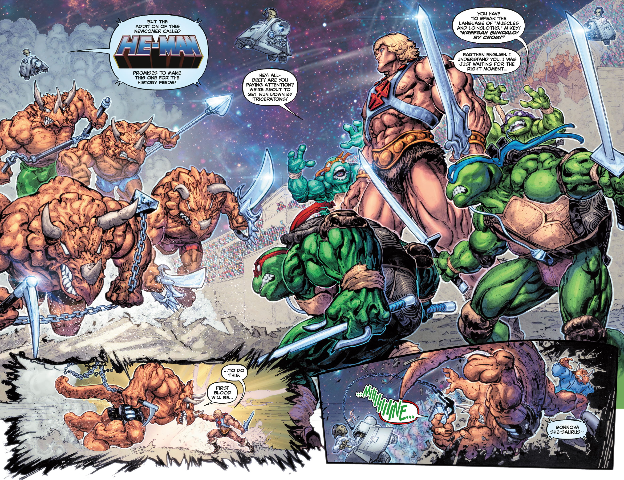 Renet is doing everything she can to stop the Teenage Mutant Ninja Turtle and He-Man universes from getting all tangled up, but they’re stuck in a time loop! And with He-Man and the Turtles on the Triceraton Homeworlds facing-off against the All-Star Team in the Tri-Sports Arena, things seem to be only getting worse...