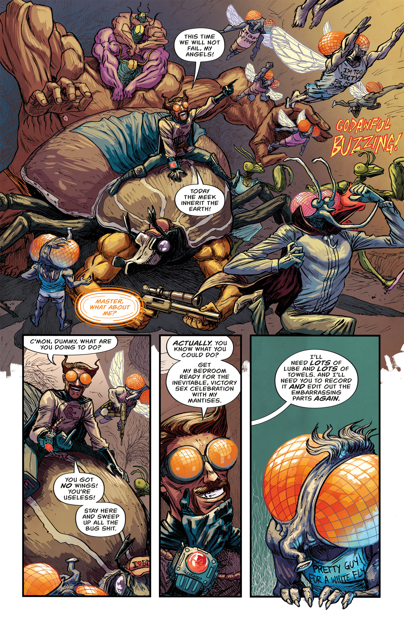 The entomologist has broken out of jail but how and what are his plans for our beloved barfly, Sh*teater? Join us for the second issue of the spin-off from the hit Patton Oswalt and Jordan Blum series Minor Threats as our favorite henchman continues to try his best in this terrible world but probably, most definitely just eats more crap.