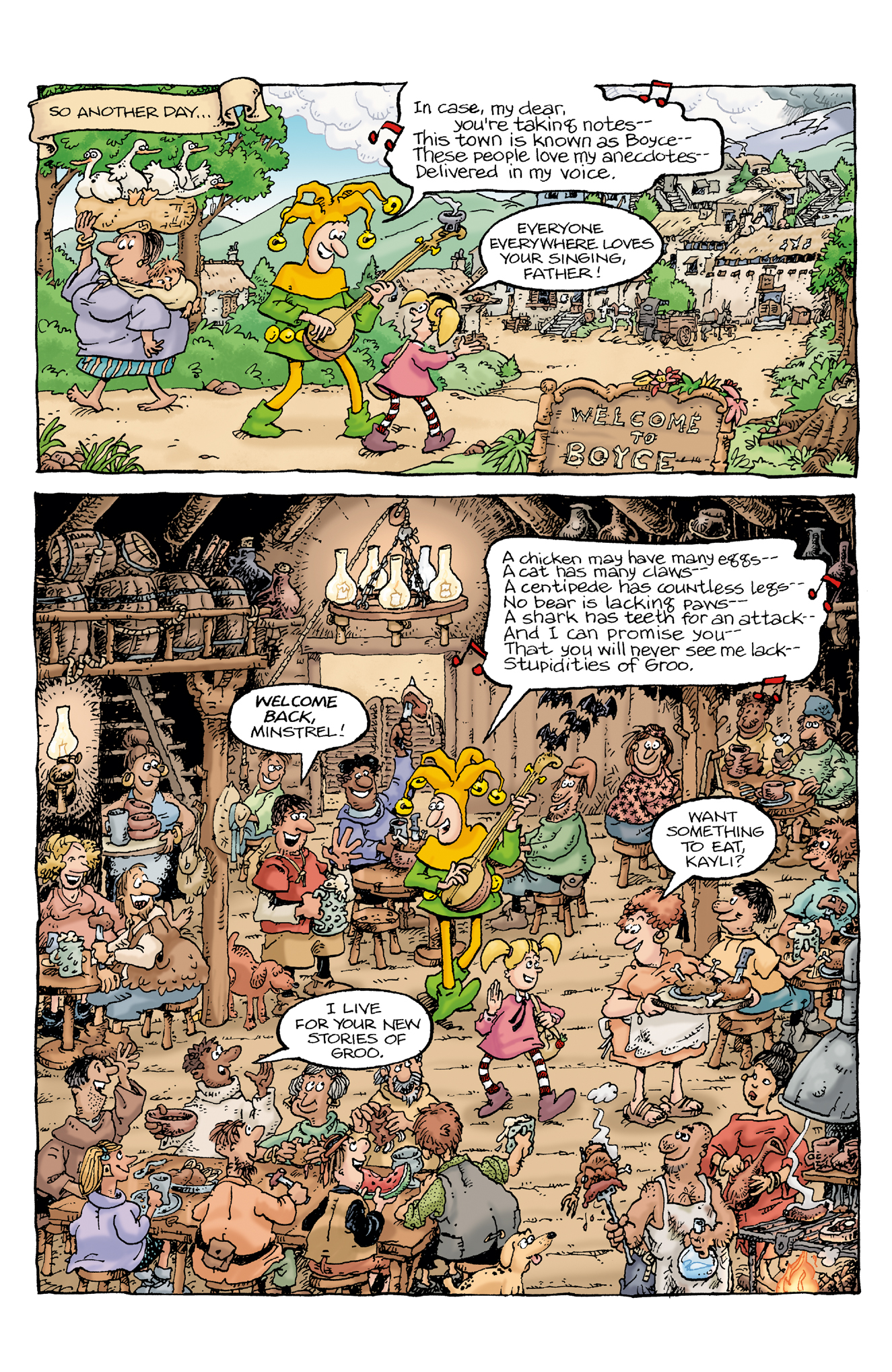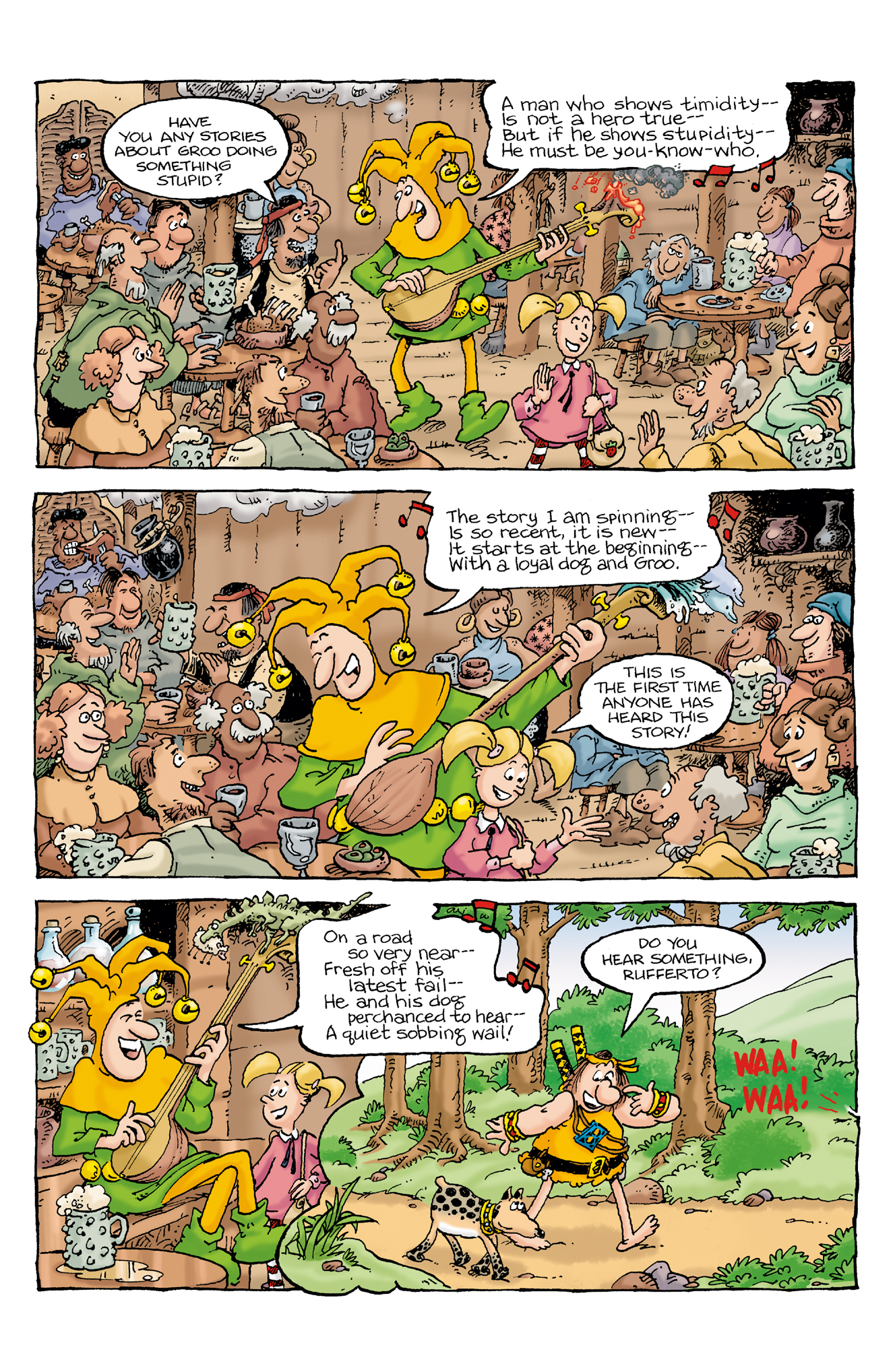 The minstrel and his daughter continue to weave tales of Groo across the land—both celebrating his unique idiocy and warning others of his deadly deeds! Sergio Aragonés and Mark Evanier deliver another hilarious Groo adventure, with exquisite colors by Carrie Strachan and Eisner Award-winning lettering work by Stan Sakai!