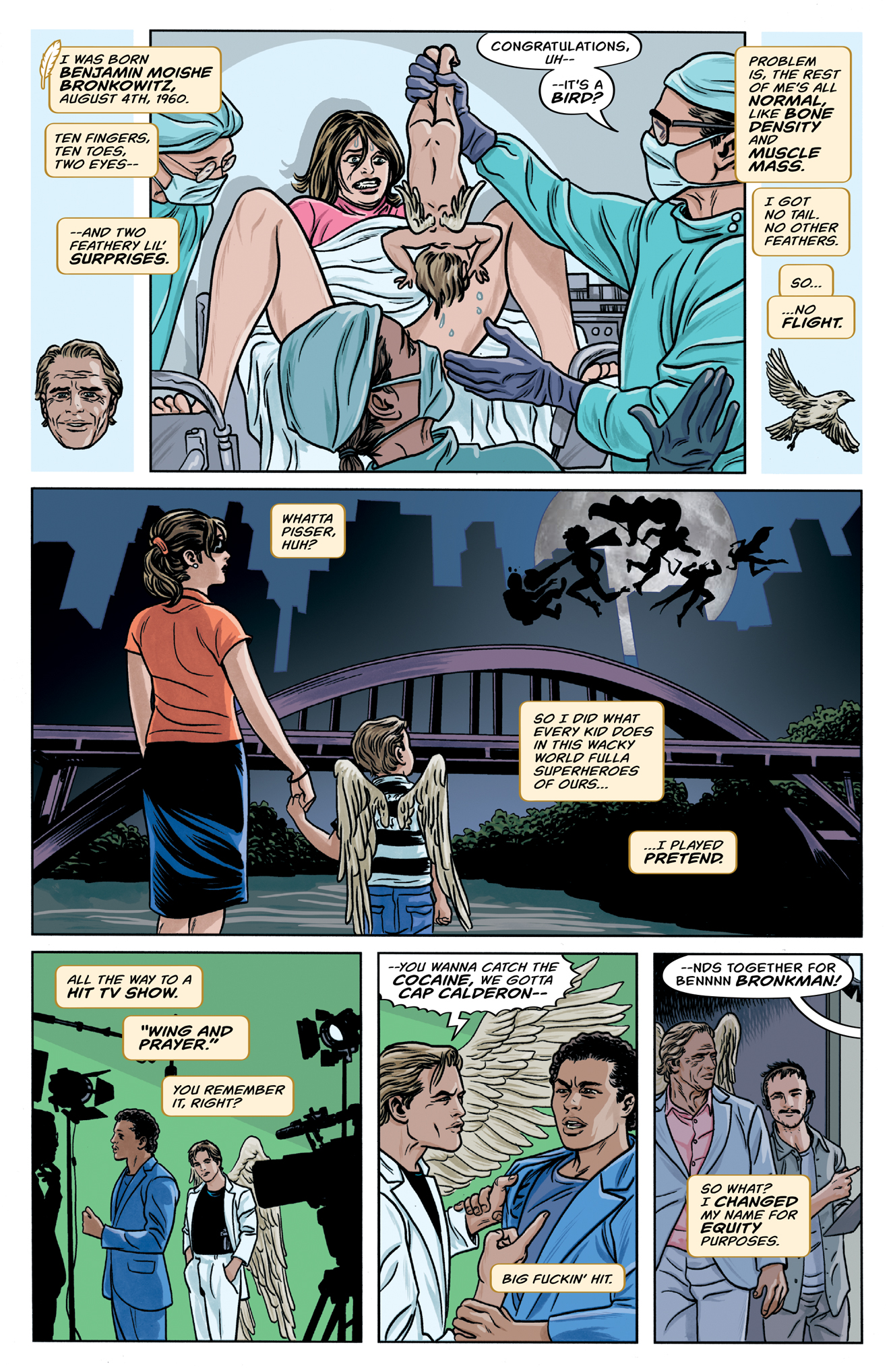 Benjamin "Brock" Bronkowicz is a washed up, bird-winged actor who is NOT a superhero, but he once played one on TV. Now Brock spends his time on the superhero convention circuit - trying to cash in on his fleeting fame, drinking away his problems as he fades into obscurity. But a chance encounter with a mysterious woman empowers Brock to fight for a life he once thought was over. Can Brock learn to fly again? Or will his vices and the ruthless gangsters on his tail clip his wings for good? Find out in the exciting first issue of a miniseries that explores the Minor Threats universe through the eyes of legendary comic creators.