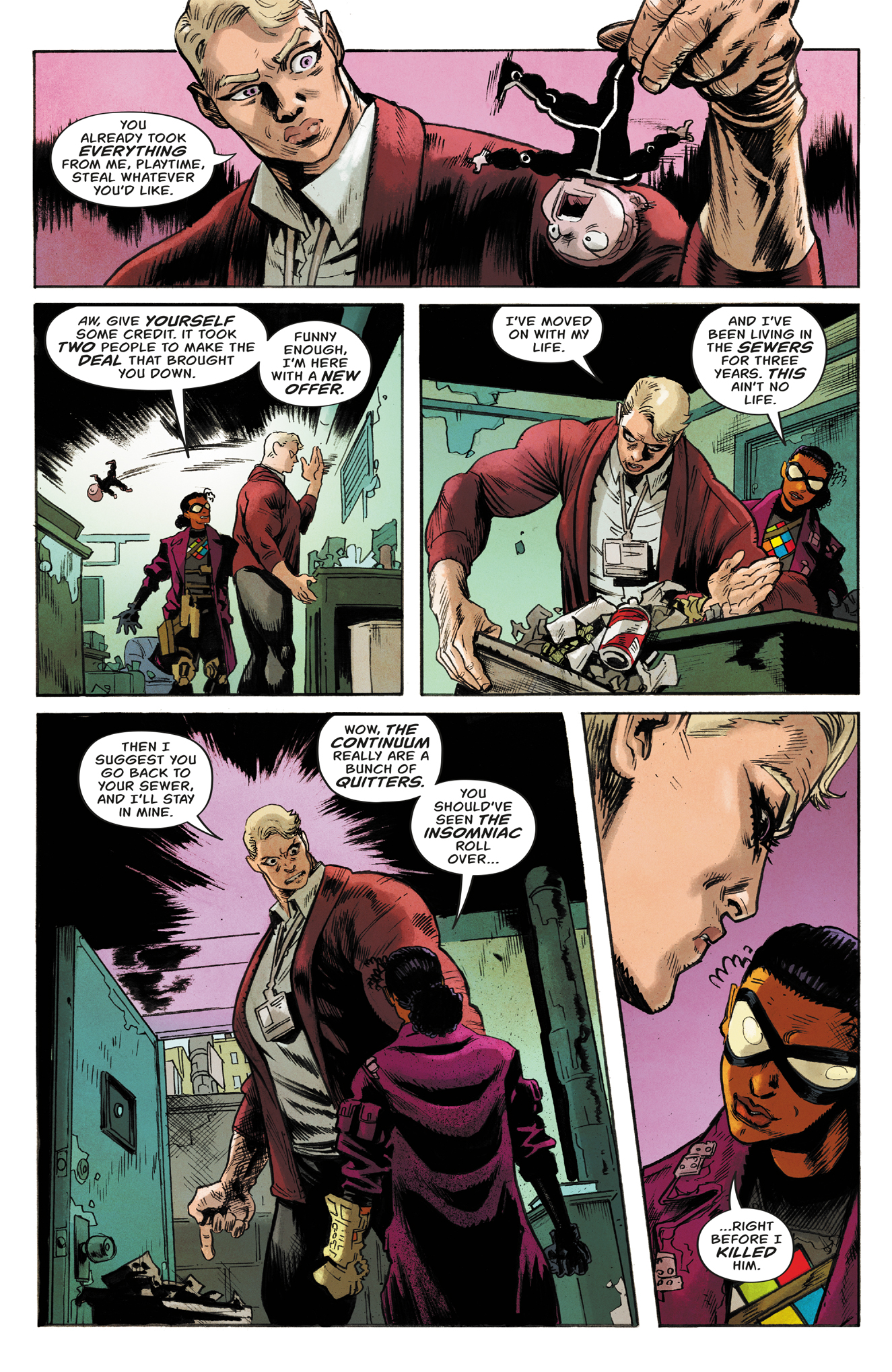 The Minor Threats have gone underground, standing on their last leg as they fight for the future of Twilight City. Frankie Follis aka the supervillain Playtime desperately needs a leader for her new ragtag team of rejects and sets her sights on recruiting the greatest superhero of all—The Searcher! After traveling to Meteor Falls she instead finds a recently depowered shell of the former champion of justice. The Searcher: no more. On top of that Frankie, Scalpel and the others are attacked by an all-new, all-deadly version of The Action. And if that wasn't enough, the team-up no one asked for—Brain Tease and Barfly pull a heist! And folks, it doesn't go well . . .