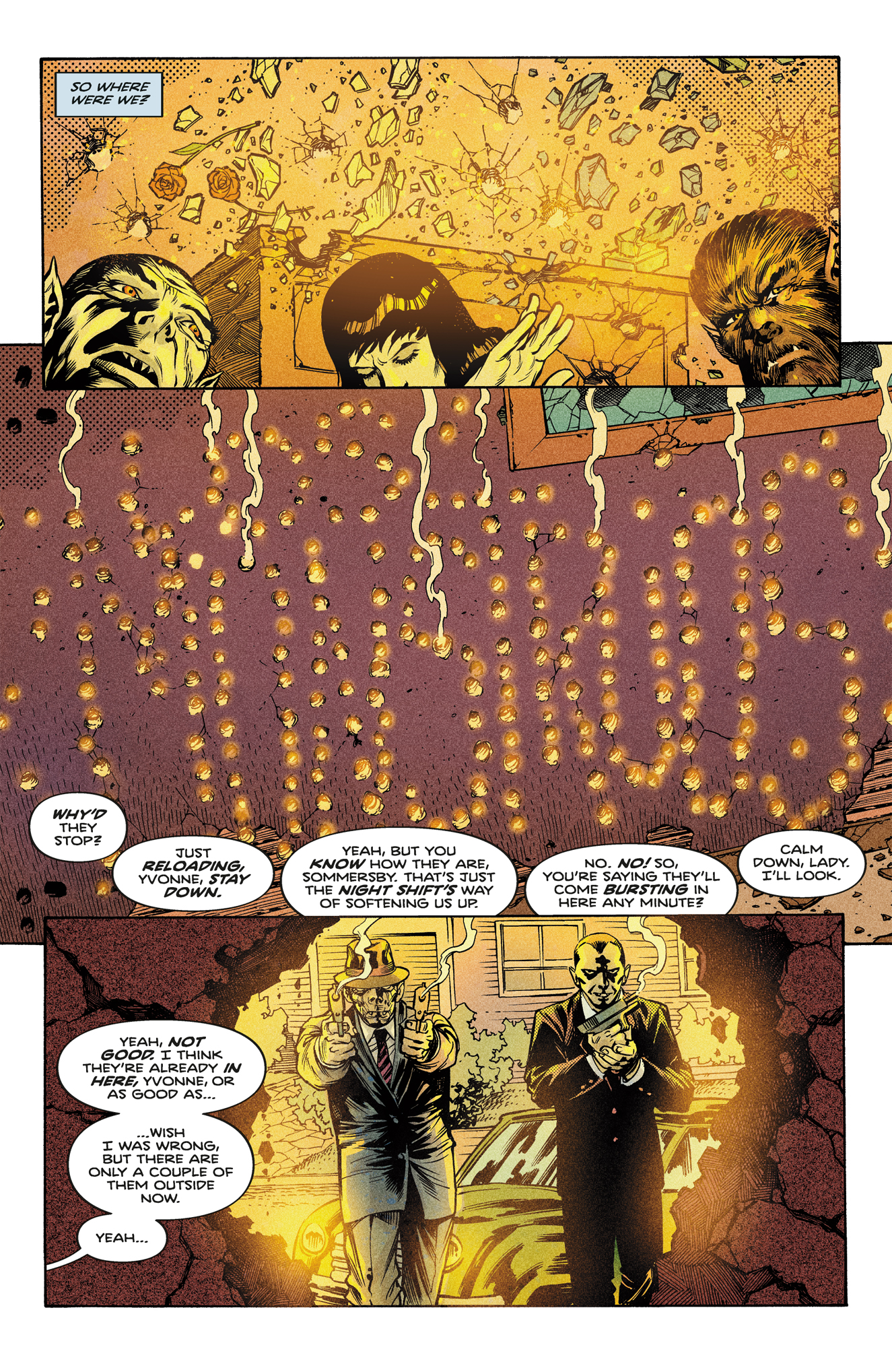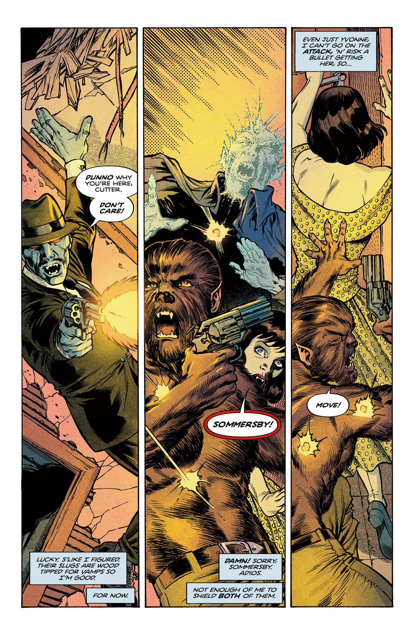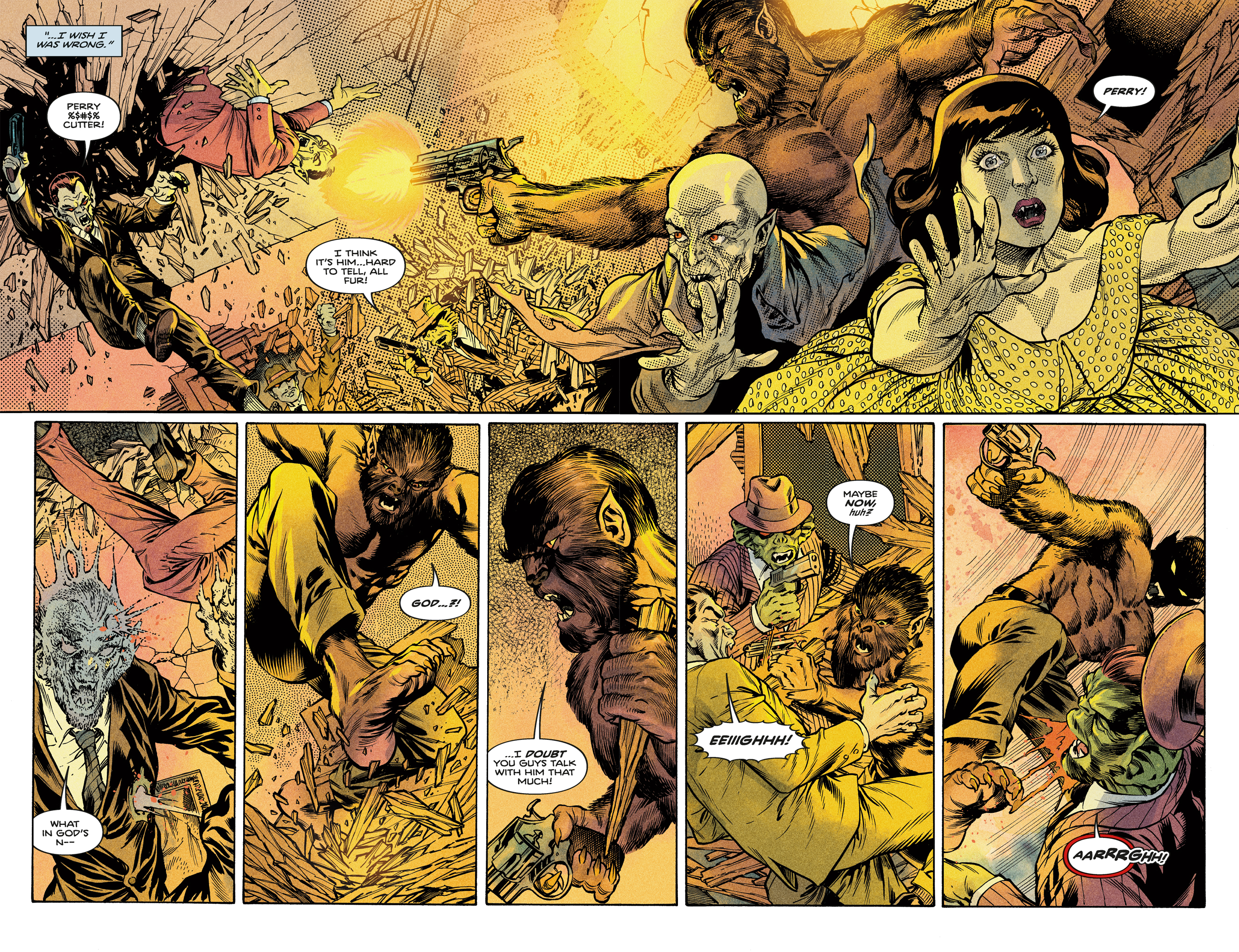 In the city of Los Monstruos, werewolf P.I. Perry Cutter had thought he’d seen it all. But now he’s in a deadly trap facing crooked vampire cops on all sides, with a surprise villain pulling the strings and no way out. It’ll take a miracle or a man-monster to help him survive the night. Will Perry solve the case? Will he finally get that date with Rosie the vampire waitress? Find these answers and much, much more in the last exciting issue of the first horrific arc of Los Monstruos.