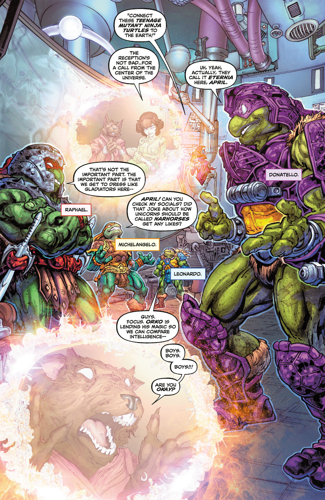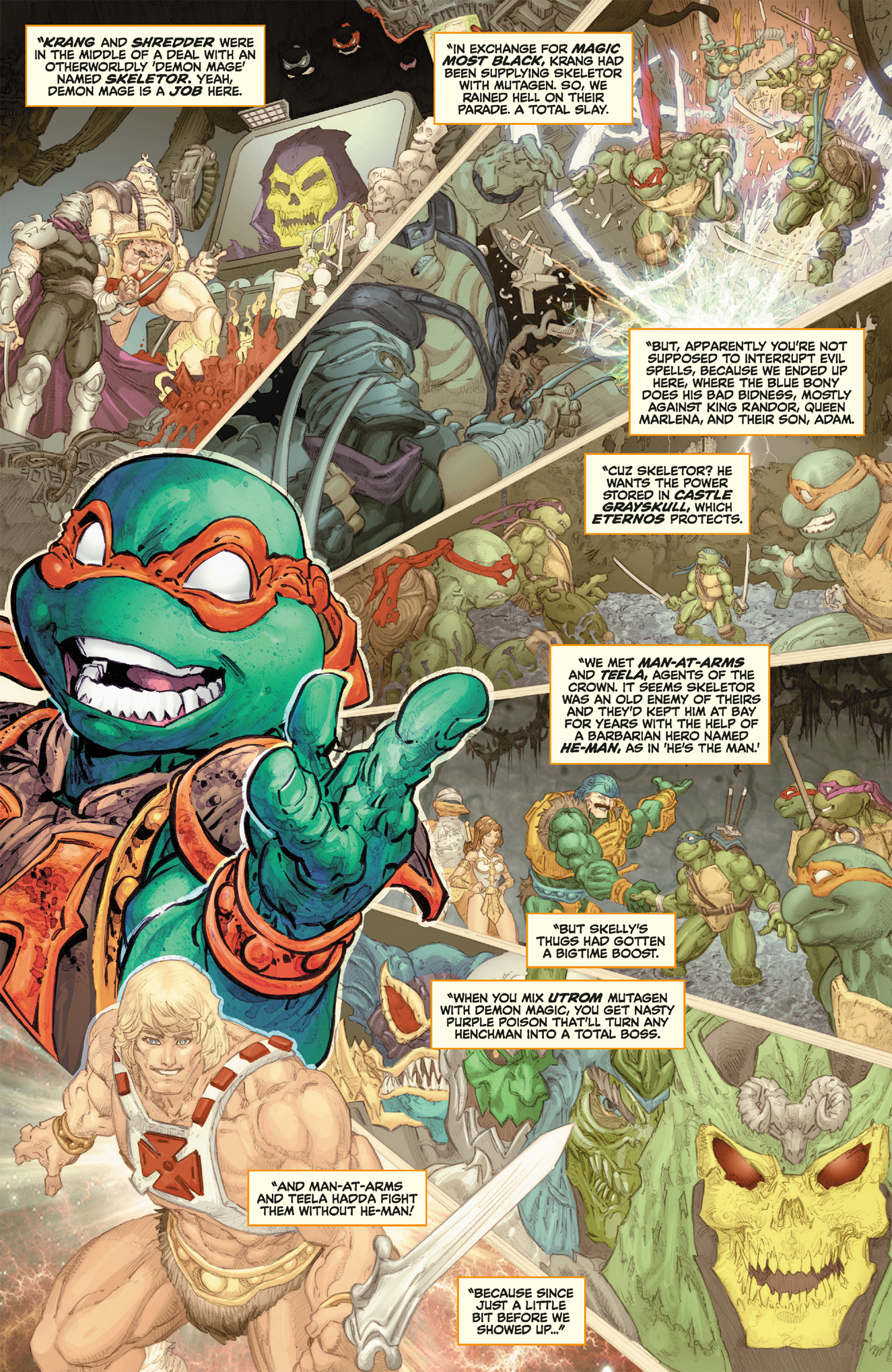 When the Teenage Mutant Ninja Turtles came across Krang and Shredder making a deal with some otherworldly ‘demon mage’ named Skeletor, things got hella weird and they ended up in ETERNIA! It turns out, when you mix Ultrom mutagen with demon magic you get a nasty purple poison—and it’s brought Eternia to the brink of chaos. So, Leo, Raph, Donnie, and Mikey are teaming up with the Masters of the Universe to kick some blue boney butt. The only problem is… He-Man is missing in action.