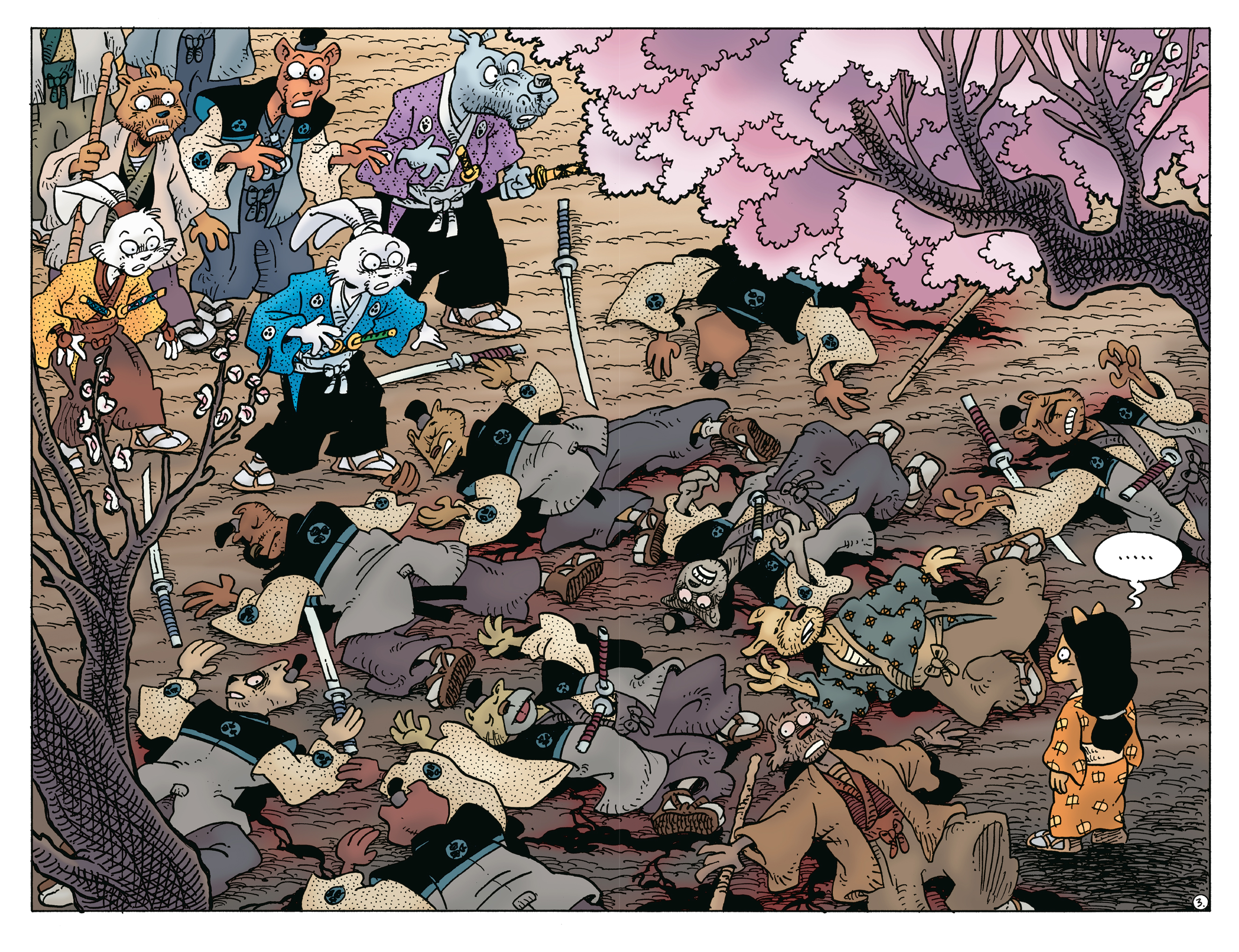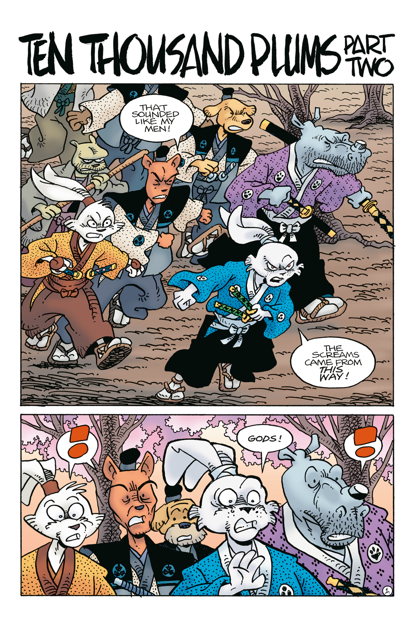 A group of the Shogun's men are found slain in the plum tree forest, and the only survivor is a young village girl reeling in shock from the attack. Usagi, Yukichi, and Gen agree to help protect the plum trees and prevent more tragedy from befalling the locals, but will their swords be enough? The latest Usagi story continues!