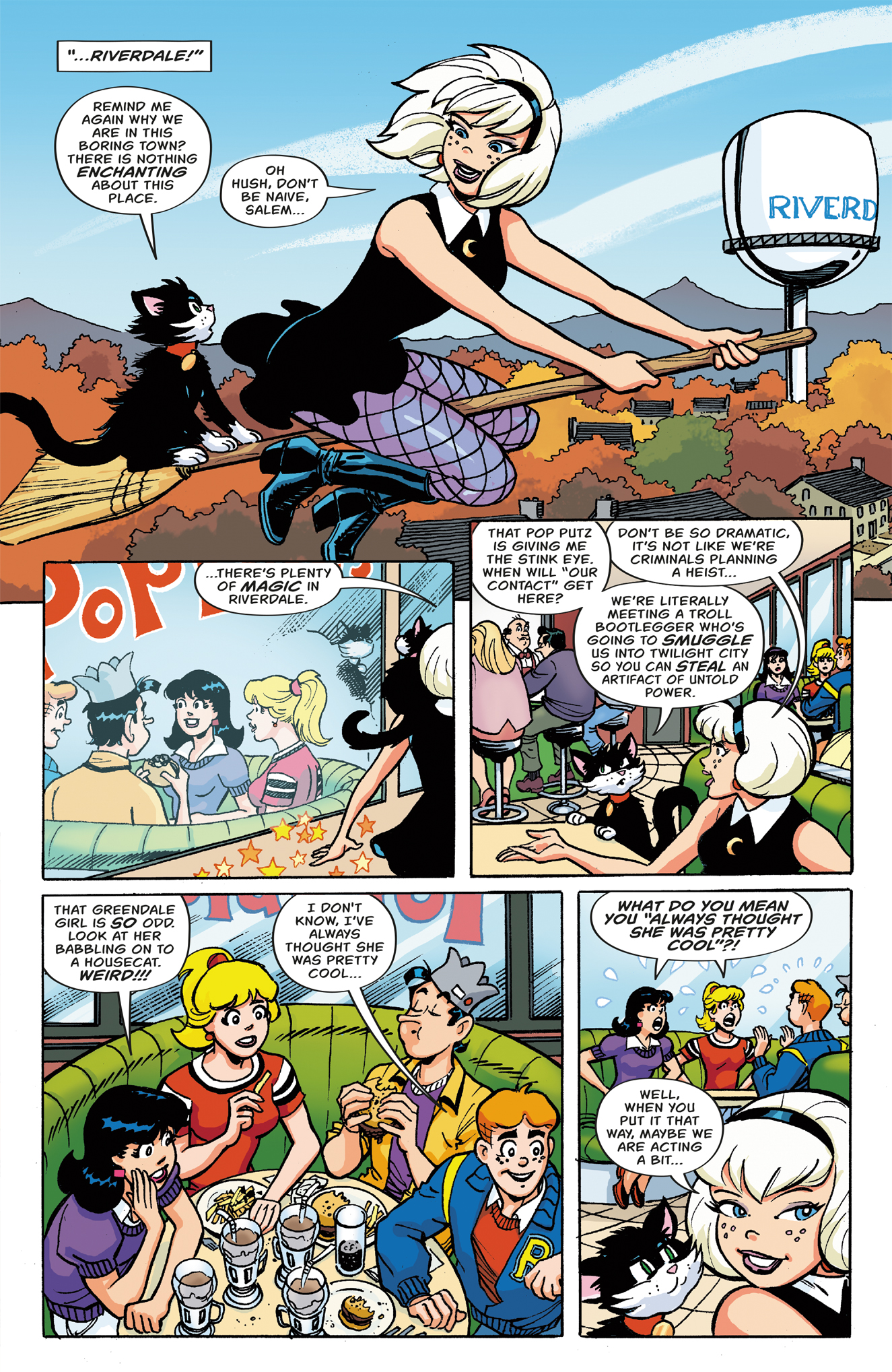 Archie vs. Minor Threats is a collision of the bright and hopeful with the dim and dirty—with hilarious results. Sabrina the Teenage Witch is the link between the two “universes,” and let’s just say that Archie from Riverdale and Playtime from Redport find their situations topsy-turvy in the craziest, scariest way.