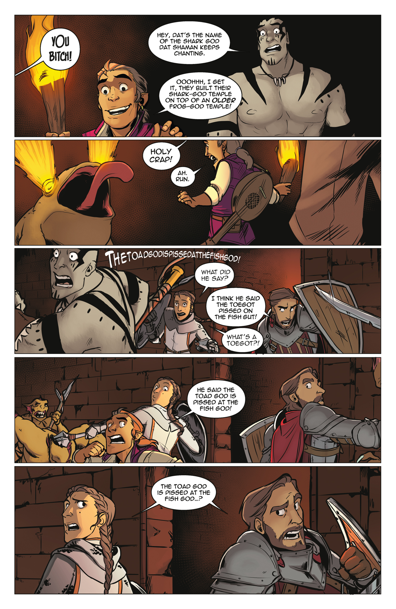 Scanlan and Grog loot a shark-man temple in the swamp outside Stilben, where they uncover priceless treasure and one strange artifact—a glowing vial of liquid. Returning to the city to determine its use, they’re almost killed by assassins and then almost arrested by the Watch! Just when they think they’re in the clear, they’re approached by an incredibly pompous magic user who threatens them if they don’t give up the vial. What’s in this flask that’s so important?