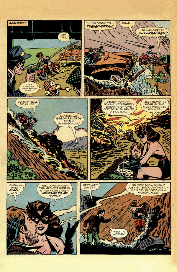 Incepted into three different public domain comics by Kinga Forrester's Bubbulat-R, the heroes of Mystery Science Theater 3000 struggle to riff themselves free. While Jonah plays second fiddle to 1940s heroine Black Cat, and Tom Servo enjoys being a real live boy in Johnny Jason, Teen Reporter, something strange is happening to Crow in the pages of Horrific . . .