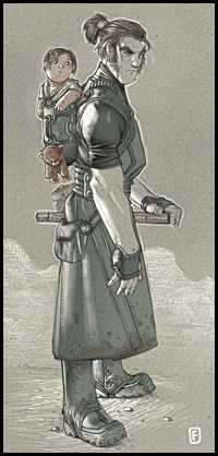 In conjunction with MegaHouse (the official licensor of Lone Wolf and Cub), and under the watchful eye and with full approval of Lone Wolf's co-creator Kazuo Koike (artist Goseki Kojima passed away in 2000), Dark Horse is launching Lone Wolf 2100. Set one hundred years in our future, the series follows the adventures of a mysterious warrior named Itto and a young girl named Daisy -- the daughter of Itto's former employer. Together they face human, robot, and android adversaries, as well as the threat of a manmade virus that is ravaging the globe. Except for a few names, and the basic situation of a taciturn warrior traveling with a child, it's not the "real" Lone Wolf and Cub. Nor is it meant to be.