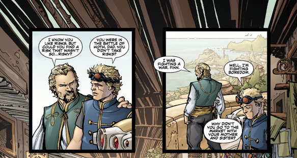 TT: To look for invasion and refugee stories, sadly, we don’t have to look any further than the planet we live on. I certainly draw a lot of inspiration from real world events and stories. This is the reason our heroes are refugees. Too often, and too easily, these poor people are seen as the problem, while the larger problem they’re fleeing is ignored. In a galaxy full of Vong and Twi’leks, Mon Calamari and Hutts, there’s still a lot of room for some humanity.