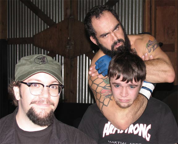 Mr. Powell visits Armstong Martial Arts in Battleground, WA. Pictured are Eric Powell (foreground), his sponsored Cage Fighter, Ray Armstrong, and his test subject.