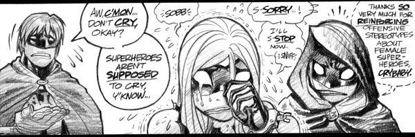 In all seriousness (well, not really), I quite enjoy capering about in the gray zone between what might be “cheesecake” and what might be “criticism of cheesecake”... or even “criticism of criticism of cheesecake,” etc., etc. Or do I even mean that? Am I just trying to see what Tarot: Witch of the Black Rose would be like, if it happened to be in B&W and didn’t make very much money? Or am I trying to spice up a character study of coping with chronic failure and low self-esteem by larding on the sex and cheesecake? Or am I engaged in an odyssey of nigh-Cronenbergian self-mutilation, as I try to see how quickly I can cripple my drawing hand* by grinding out 200 pages of pencil-heavy artwork over ludicrously short timeframes? Or am I just being an obnoxiously insincere jackass? You decide!