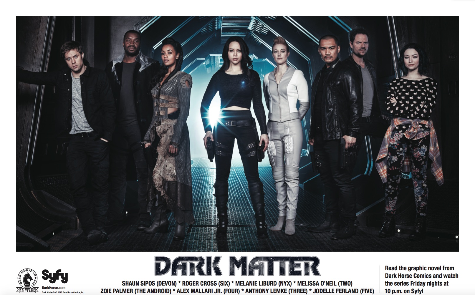 Dark Matter cast poster signed by Melanie Liburd (Nyx) Melissa O'Neil (Two) Alex Mallari Jr. (Four) Anthony Lemke (Three) and Jodelle Ferland (Five)