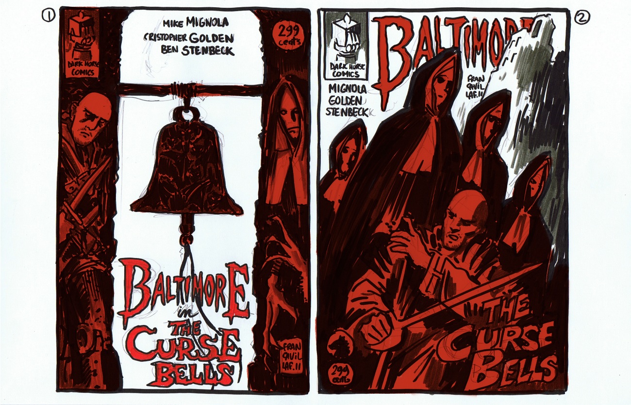 As with my other covers, it all started with a detailed synopsis and breakdown of the miniseries. Reading through the script, I decided right away I wanted to feature the creepy nuns and the monastery (where the curse bells of the title reside) on the cover. As usual, I did a couple of sketches to give some options to Scott Allie and Mike Mignola.