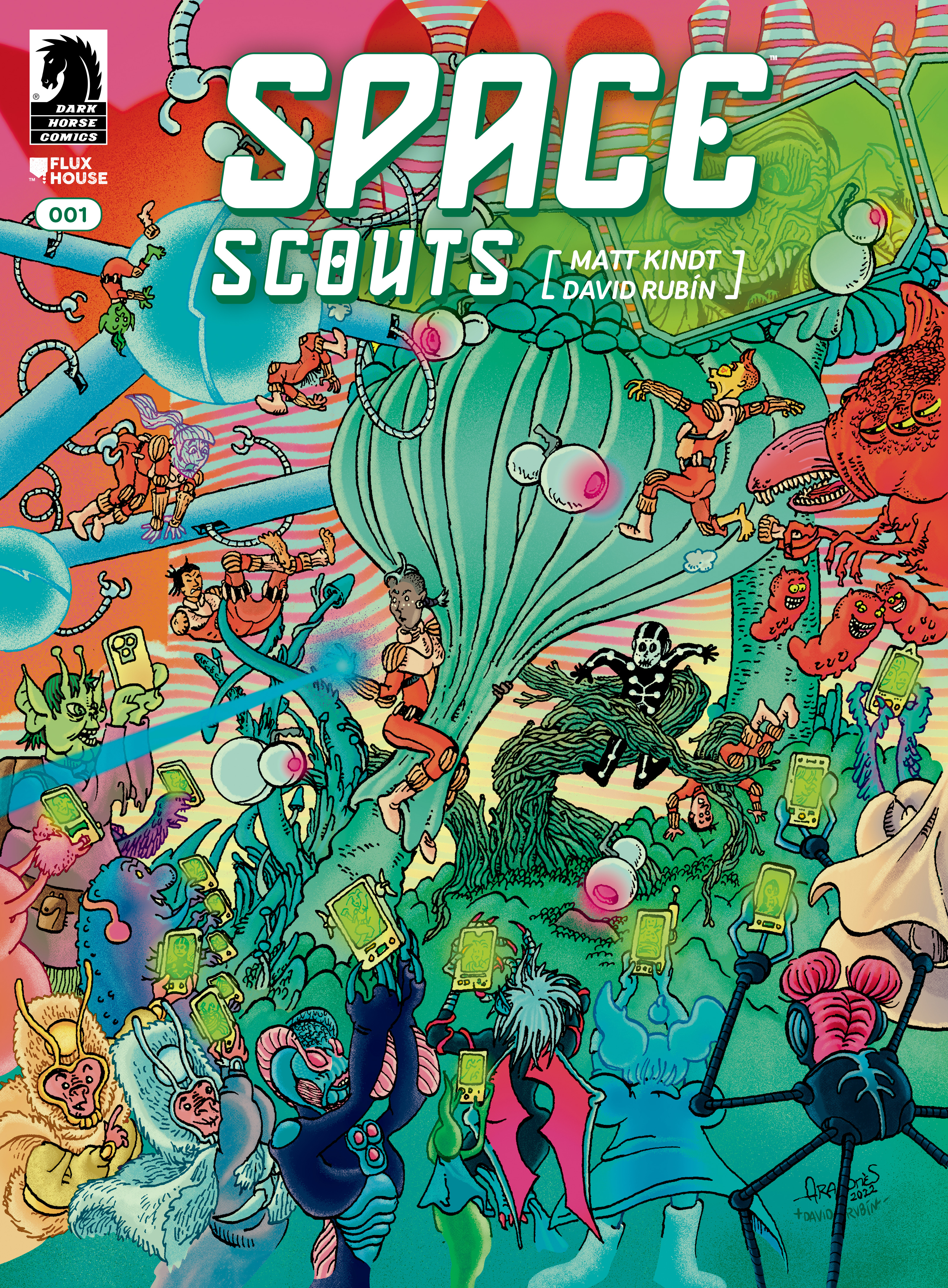 Dark Horse Comics and Flux House Books present Space Scouts, a new sci-fi space odyssey comic series from Matt Kindt and David Rubín, the team behind the acclaimed sci-fi/fantasy comic series, Ether. This three-issue series, written by Kindt (Gilt Frame, If You Find This, I’m Already Dead) and illustrated and lettered by Rubín (Operation Sunshine, Cosmic Detective), will be presented in magazines-sized issues (8” x 10.875”) with 32 story pages. Each issue will also include bonus content like character designs and variant covers by Sergio Aragones (#1), Brian Hurtt (#2), and Alvaro Martinez Bueno (#3).