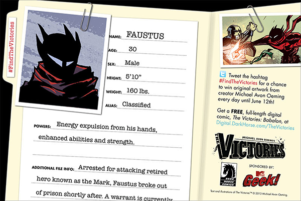 On June 12, Dark Horse Comics is releasing their collected edition of the first five-issue miniseries – and to celebrate, Dark Horse and MTV Geek are giving away six 'case files' spotlighting the characters of The Victories universe, each containing a piece of original Mike Oeming artwork!