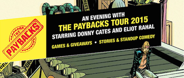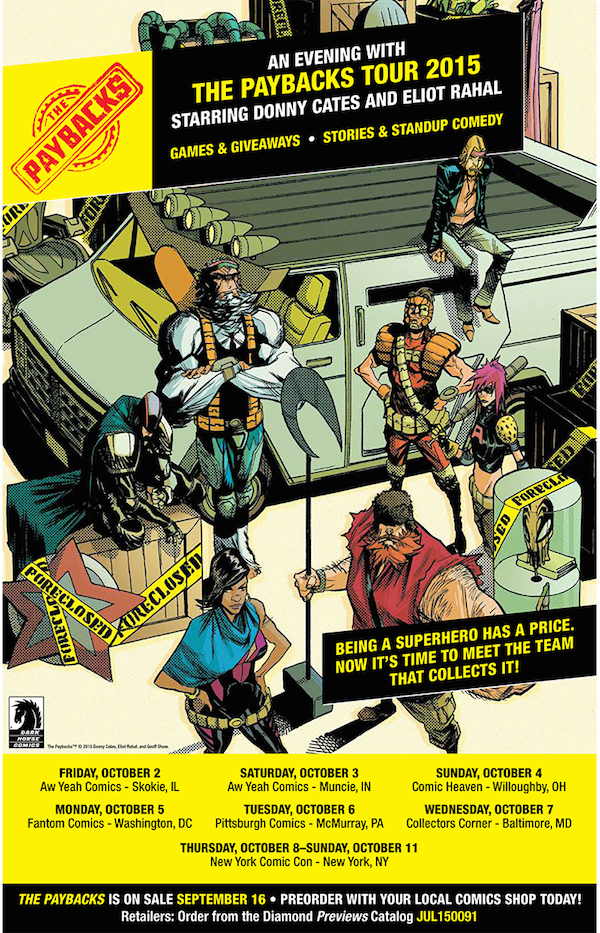 Being a superhero has a price. Meet the team that collects it! On September 16, 2015, Dark Horse Comics will launch a brand-new ongoing series: The Paybacks! In honor of the occasion, writers Donny Cates (Buzzkill, The Ghost Fleet) and Eliot Rahal (Heavy Metal, Dark Horse Presents) will hit the road on their way to New York Comic Con with their variety show, “An Evening with the Paybacks,” sponsored by Dark Horse Comics! Each night from October 2 to October 7, Cates and Rahal will visit one of six select retail stores for a signing followed by an evening of storytelling, games, giveaways, and standup comedy. Friday, October 2—Aw Yeah Comics, Skokie Signing: 6:00 p.m.–7:00 p.m. Event: 7:00 p.m.–8:30 p.m. 4933 Oakton St., Skokie, IL 60077 Saturday, October 3—Aw Yeah Comics, Muncie Signing & Event Times TBD 107 N High St., Muncie, IN 47305 Sunday, October 4—Comic Heaven Signing & Event Times TBD 4847 Robinhood Dr., Willoughby, OH 44094 Monday, October 5—Fantom Comics Signing & Event Times TBD 2010 P St. NW, Washington, DC 20036 Tuesday, October 6—Pittsburgh Comics Signing & Event Times TBD 113 E McMurray Rd., McMurray, PA 15317 Wednesday, October 7—Collectors Corner Signing & Event Times TBD 7911 Harford Rd., Baltimore, MD 21234 http://www.collectorscornermd.com/ Thursday, October 8–Sunday, October 11—New York Comic Con If you are near any of these locations, stop by and party with The Paybacks! Praise for The Paybacks: “A strong debut that’s heavy on laughs framed in a well balanced and engaging visual package.”—All-Comic “The Paybacks is absolutely bloody hilarious.”—Big Comic Page “Donny Cates and Eliot Rahal excelled at presenting a vibrant satirical script of the superhero genre that simply belongs in a class of its own.”—Comic Crusaders “The Paybacks #1 is a comic you will read over and over again, and then pass it along to your friends proclaiming ‘you have to read this.’ ”—Geeks With Wives “A joyride from start to finish that you don’t want to miss.”—Graphic Policy |