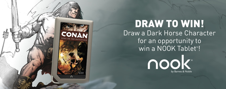 To enter, submit a drawing of your favorite Dark Horse character interacting with a NOOK, bonus points for creativity! Perhaps it's Conan with a NOOK for a shield, Hellboy attempting to break out of a NOOK, or Darth Vader just kicking back enjoying reading comics on his tablet. The possibilities are endless and we are excited to see what you can create.