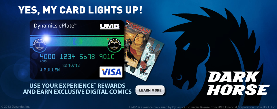 Dark Horse Comics has secured the right for Dark Horse customers to get exclusive, early access to apply for the revolutionary new-battery powered Dynamics ePlate™ credit card before anyone else! Apply at dynamicsinc.com/darkhorse. We’re also excited to inform you that we just launched a brand new comics experience™ on the game-changing device so that you can earn exclusive, physical Dark Horse comics just by making your everyday purchases.