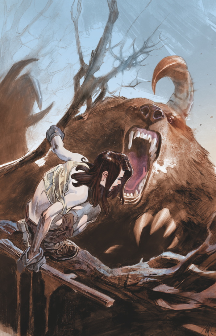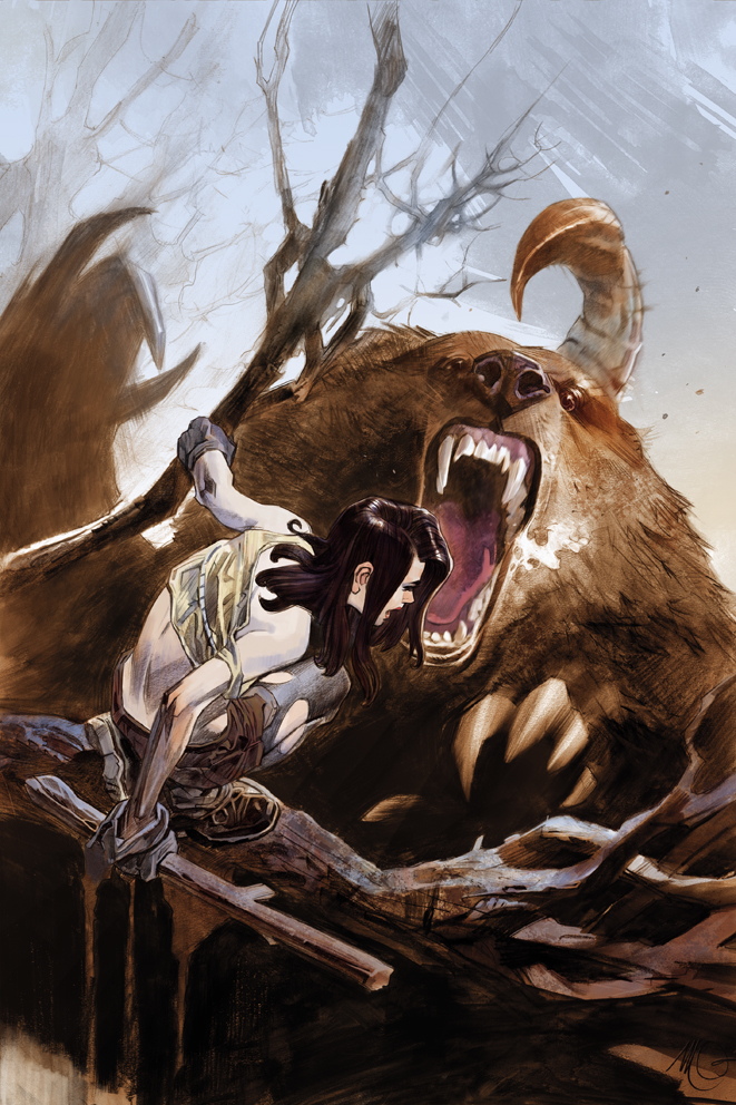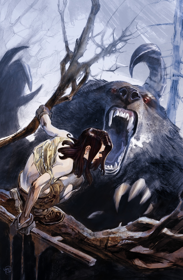 Definitely some stark contrast between Orchid and the bear now, but we’d gone from too brown to too blue. The blue coloring here also gave the appearance that this scene takes place in a cold climate, which is definitely not the case in the Wild (as you’ll see in issue #2). So, we took these two strong images and asked Massimo to combine them . . .
