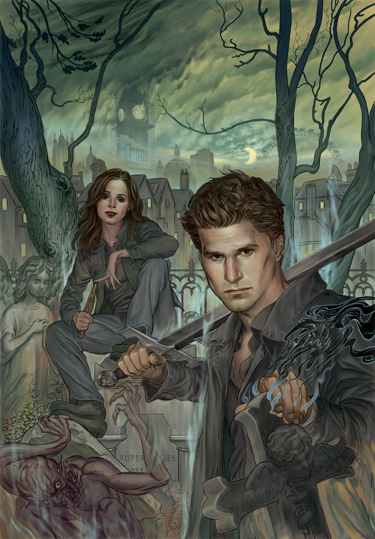 I start by finding out as much specific info as I can about the issue. In the case of Angel & Faith #1, the only particulars given were Angel and Faith in London (with a partially reconstructed Big Ben). When developing ideas, I don't really consider what I should or shouldn't do or what is too over the top; I just free the ponies of my imagination and keep my fingers crossed…Thankfully both Dark Horse and Joss have been very open to even my strangest ideas, LOL.