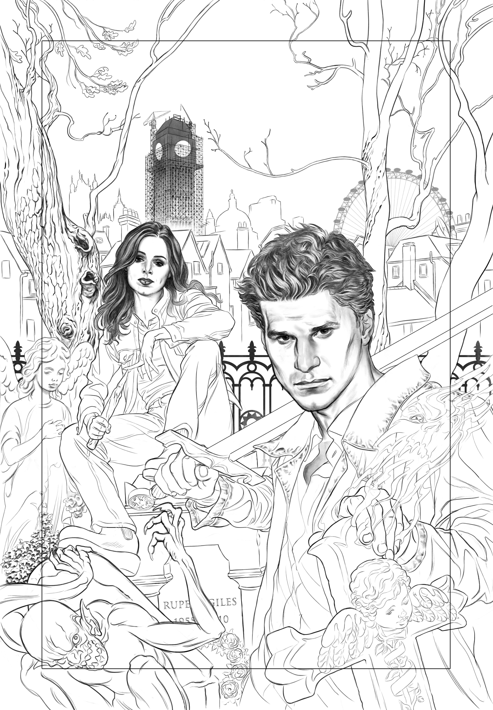 At the time I finished the pencils for this cover, the Buffy Season 8 finale was approaching release, and DH suggested that Giles's name be added to the tombstone on which Faith was sitting…so after processing that surprise about Giles, I edited the stone, and waited for approval.