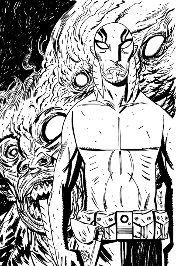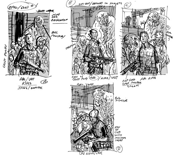 GUY DAVIS: I drew a few initial sketches for the first-issue cover, mostly Abe in an action pose with monsters and the punks behind him. John wanted to mix it up from the feel of some other covers we did and came up with the idea of Abe standing and looking out at the reader in front of a transforming monster.