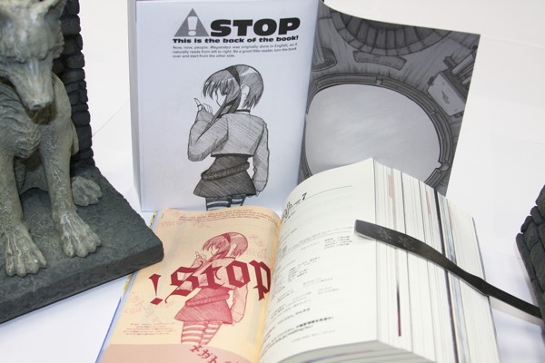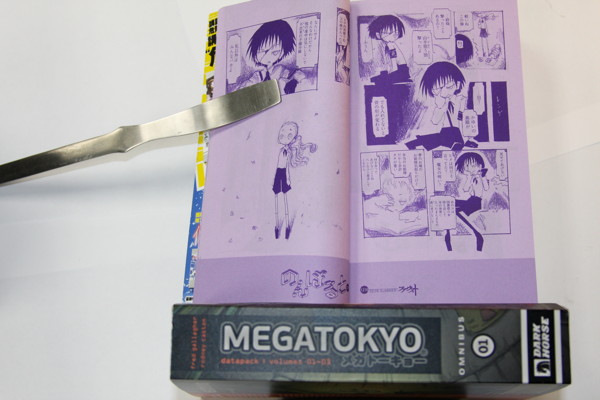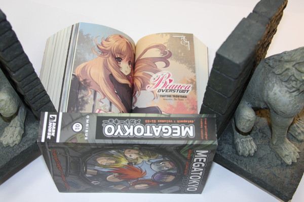 As you can see, the Megatokyo omnibus, in the tradition of Japanese manga magazines, is thick, and ideally to hold these books open we should have used something both cute and dense, like Ayumu Kasuga. However, in the spirit of Dark Horse's eclectic publishing program, we instead used these Game of Thrones Direwolf Bookends. I suppose it could be Mr. Tadakichi if you squint.