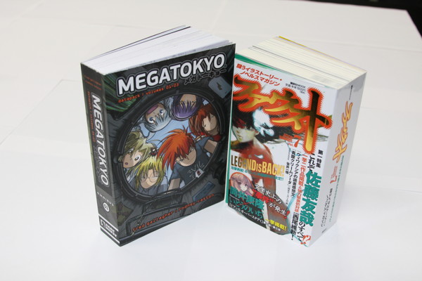 Now, as you might guess, Dark Horse's new edition of Megatokyo is the book on the left. But next to it on the right is the magazine in which the Japanese edition of Megatokyo appeared, inside the giant-sized (over 1200 pages!) Summer 2008 issue of Kodansha's Faust. Fred Gallagher wrote the afterword to Oh My Goddess! COLORS, in which he recalled his first encounter with the manga, and how Kosuke Fujishima became one of his greatest influences. It was fitting that it was Kodansha, who publishes the original Oh My Goddess!, should also publish Megatokyo in Japan; some of you may have also encountered the two English editions of Faust that were released by Del Rey in 2008-09.
