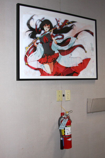 Further down the hallway, even the space above the fire extinguisher is claimed for manga—in this instance, by a portrait of Saya Kisaragi from Blood-C. Despite appearances, in case of Saya the fire department will be of limited use; you're much better off calling the paramedics, and then perhaps the coroner.