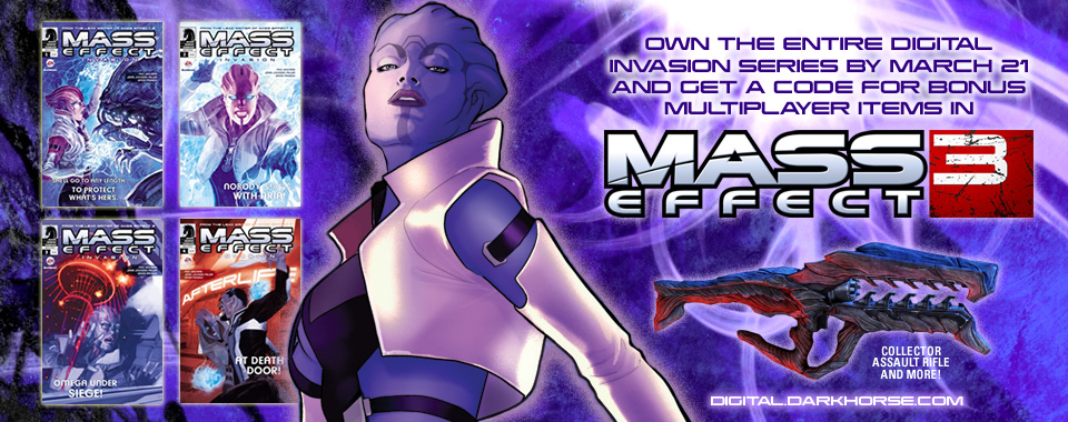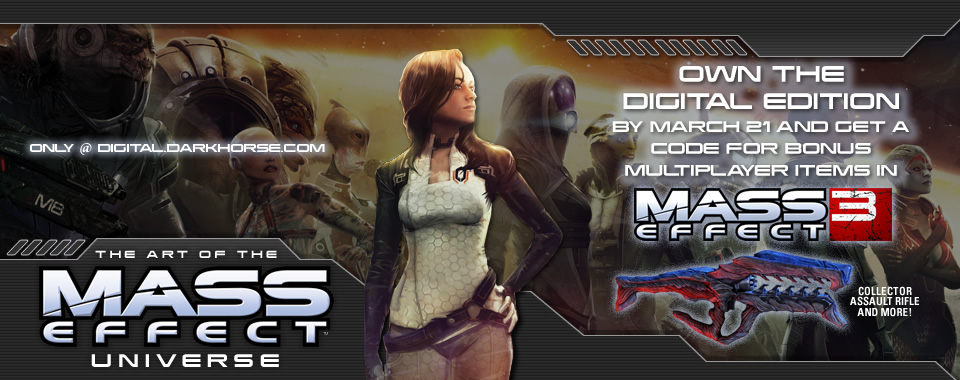 BioWare and Dark Horse Comics are excited to team up today to announce that fans who purchase the digital version of The Art of the Mass Effect Universe or the entire Mass Effect: Invasion series through Digital.DarkHorse.com will receive a limited code to unlock a Reinforcement Pack containing in-game items to be used on PC or the Xbox 360 video game and entertainment system in the co-op campaign in 2012’s most anticipated game, Mass Effect 3.* Anyone who has The Art of the Mass Effect Universe or Mass Effect: Invasion issues #1–#4 in their Dark Horse Digital account by March 21, 2012, will be eligible to receive the code.