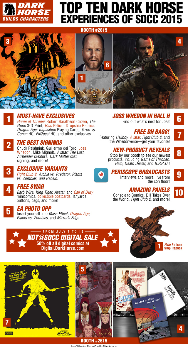 Check out the top ten Dark Horse Experiences of SDCC 2015 and be sure to stop by the Dark Horse booth #2615 for all the must-have exclusives, signings, free swag and more!