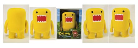 In addition to the 8" vinyl figures, Dark Horse has produced a highly successful line of Domo products, including a self-mailer stationery set, two journals (one in the shape of Domo), an embroidered patch, and a sculpted magnet. Future licensed products in development include a line of 5.5" vinyl figures, again featuring color variants, and a very large 18" limited-edition version. The canary yellow Domo will be sold exclusively during Comic-Con International for a retail price of $40.
